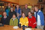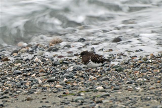 We had an eccentric group of 10 birders on a rainy and discombobulated outing to Point Roberts this morning. First-timer Judy Kilcup along with Anne’s present and future New York City children, Catharine & Chris, were welcomed by the regulars. Photo evidence of the group taken at Petra’s (without Roger and photog Don), along with a few shots of some birds we saw today (taken by Rochelle) are attached. Following introductions, a driving tour of Tsawwassen in search of a Passport and chats with US Customs, we all eventually met up at Lighthouse Park. The tide was high and the temperature was not too cold (~9 degrees C), but the off-and-on drizzling rain was more than a nuisance (e.g. constantly fogged-up bins). However, we (that’s the “Royal we” which does not necessarily include me) had some neat sightings; including: lots of Common Loons (and a Red-throated but no Pacific’s seen), Surf Scoters (and probably White-winged, but no Black seen), Common Goldeneye, Bufflehead, Harlequin Ducks, Greater Scaup, three Cormorant species (Double-crested, Pelagic and Brandt’s), Brant Geese and Pigeon Guillemots in their white Winter plumage. A flock of about 20 Black Turnstones entertained us as they were feeding along the shore, up-close-and-personal, with a few Sanderlings joining them. We walked the bush trail back to the parking lot, and between chats, we saw a few birds, including nice looks at Golden-crowned Kinglets and Fox and Song Sparrows.