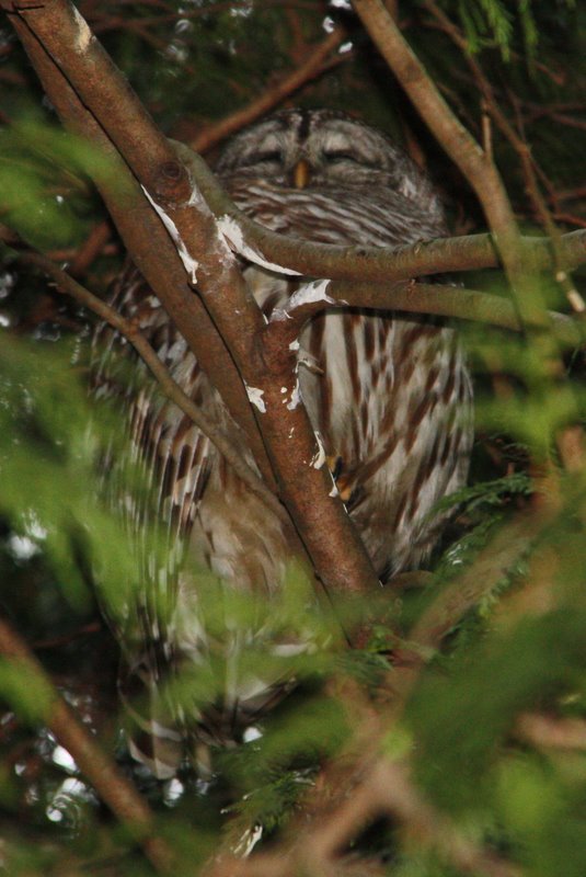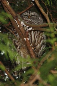 At Alaksen, we photographed the two Barred Owls in the conifers lining the entrance drive; of course, Kay and Roger spotted them first. Roger opened one of the many pellets littering the ground under the trees, most contain Townsend Vole skeletons. We also saw a flock of about 50 American Goldfinch. Hooded Mergansers swam in the pond near 20 lounging Great Blue Herons. Bufflehead and Common Mergansers were in the river. We visited the Feds’ Offices in the old Reifel Home and enjoyed interesting chats with Dave Smith and then Pete Davidson of Bird Studies Canada (BSC). Leaving Alaksen on Westham Island Road, Kay spotted another raptor which at first we thought was an immature American Kestrel, but then later determined it to be a Merlin (Pacific Black). See the photo attached, along with other outing photos taken by Rochelle Farquhar and Terry Carr. We returned to Petra’s around 1:15 p.m.; I think I may have missed reporting on some sightings, but I’m sure some of the outing participants will remind/correct me. It was another very enjoyable outing. ine birders (Val, Don & Rochelle, John & Kay, Hans-Ulf, Roger, Terry) joined me on Monday morning on an outing via the Tsawwassen First Nations Reserve and South Ladner farmers’ fields to Alaksen NWA. It was an off-and-on rainy morning but relatively mild. Our first stop was the “Kingfisher Bridge” on the First Nations Reservation, and the female Belted Kingfisher obliged us by posing on one of her regular roosting branches. The water was very high and the only ducks there were 4 Green-winged Teal. A Northern Flicker dropped by for a look at us on a telephone pole just above us. Then a pair of Bald Eagles “squawked and mounted” in a nearby tree, entertaining us for a few seconds. We stopped again at the end of the Reserve and saw a Merlin cruising along the dike. A Golden-crowned Sparrow posed in a nearby bush and two Red-tailed Hawks rested on telephone poles along the path. We left the Reserve following “Pete Davidson’s bike route” toward Alaksen. We saw several small flocks of Trumpeter Swans, but could not pick out any Tundra’s. We unsuccessfully searched for the Gyr Falcon at Deltaport Way, but Kay spotted a neat Peregrine Falcon in a tree near 28th Avenue. We also scoped other Red Tails, but could not transform any of them into Gyrs. We “may” have seen the Rough-legged Hawk that is regularly there. We were also blanked on the American Kestrel, often seen in this area. The shrubs housed a number of White-crowned Sparrows and House Finches. North of Deltaport Way we found the field of Western Meadowlarks; Roger counted nine – nice to see these birds here in Winter. Several other raptors were sitting in trees and Northern Harriers cruised by frequently. Lots of American Robins, Spotted Towhees and House Sparrows in the shrubs along the roads.We stopped at Wellington Park near the fish plant, but the California Sea Lion was not there. We saw a few Common Mergansers, American Wigeon and Double-crested Cormarants. A huge swarm of Dunlin caught our attention in the distance as it weaved over Steveston. We drove quickly over the Westham Island Bridge to Alaksen, glancing at the four Western Grebes and raft of Green-winged Teal at the bridge. We did not search for the Eurasian Green-winged Teal that has been seen there. We drove by several flocks of Trumpeter Swans in various fields. At Alaksen, we photographed the two Barred Owls in the conifers lining the entrance drive; of course, Kay and Roger spotted them first. Roger opened one of the many pellets littering the ground under the trees, most contain Townsend Vole skeletons. We also saw a flock of about 50 American Goldfinch.