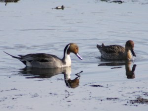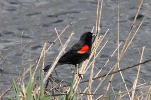We turned back at the Point, taking the inland trail. A couple of Northern Flickers caught our attention. Several Tree Swallows were circling and one beauty landed on a stick to pose for the photogs. Terry McComas of Delta Nats recently cleaned and closed the many Bird Boxes in the Park, just in time for the Swallow arrival. We saw lots of raptors, including Red-tailed Hawks and a very interesting pair of Northern Harriers that entertained us with their pre-mating acrobatic displaying. A few of our participants were “turned on”. Of the many LBJ’s (Little Brown Jobs), we were able to identify Song, Fox and Golden-crowned (and perhaps White-crowned) Sparrows and House Finches. Some saw a Bewick’s Wren and we heard many Marsh Wrens. Finally a Marsh Wren rose to the top of a bullrush giving us a good view. American Robins, Spotted Towhees, colourful Red-winged Blackbirds and Black-capped Chickadees were everywhere.