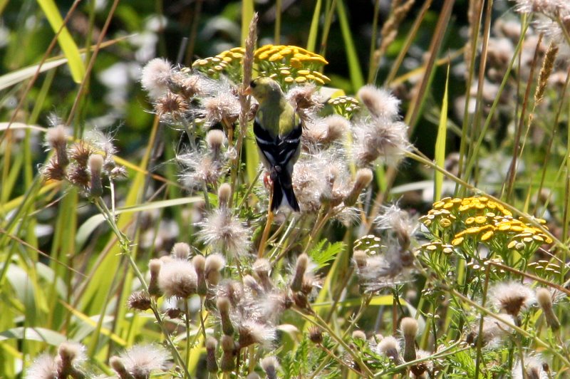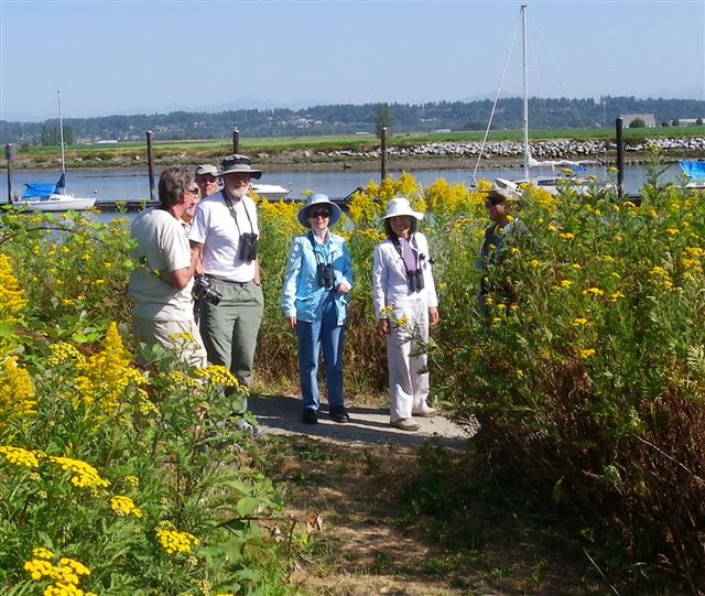 We drove to Elgin Heritage Park in South Surrey where we met Rick and Marg. The “regulars” were seen around the marina, that is; Cedar Waxwings, House Finches and lots of brilliant American Goldfinches, and the Belted Kingfisher (Male). An adult Bald Eagle posed all morning on the top of a sailboat mast. Rufous Hummingbirds were hanging around the beautifully coloured plants (again, Anne and Roger repeated the plant names, but I forget). Willow Flycatchers were calling and we got good looks at a family. Marg and Rick saw a Yellowlegs, but surprisingly we did not see any Shorebirds in the Nicomekl River today (last visit here we had Long-billed Curlews and Marbled Godwits). Not many Red-winged Blackbirds around and a few LBJ’s gave us a challenge to identify. We heard the honk of a Red-breasted Nuthatch.