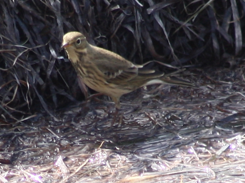 At the foot of 88th, following a nice chat with a farmer parking cop, we canvassed the shorebirds, and then John spotted a very cooperatively posing Merlin in the tree behind us. Merlins are not uncommon along here, now that the shorebirds have begun to arrive. A flock of American Goldfinch feeding on the thistles got our attention; meanwhile a pair of squawking gulls were having an aerial fight nearby. I ignored them, only to learn later from Roger and Gord that one of the “gulls” was a Parasitic Jaeger chasing the gull. Another sighting I missed. Among the several species of gulls there were Ring-billed and Bonaparte’s. Most shorebirds were far out, but several small flocks (~20 birds) would fly by us and occasionally land near the dike. We identified lots of Pectoral Sandpipers and a few Baird’s. Several American Pipits were also foraging along the shore as were some Brown-headed Cowbirds. We did not see the Buff-breasted Sandpiper which was seen that morning in the area we walked between 88th and 104th, nor the Marbled Godwit or Red Knot. A grand morning!