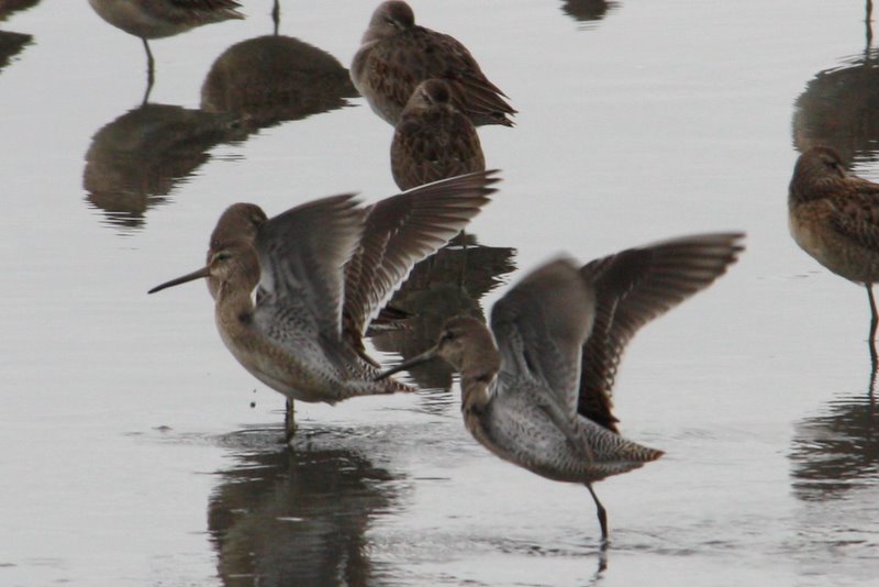 At the tower the flock of I guess a few thousand Dowitchers feeding up-close-and-personal was amazing. Because they were so close, we did not mind Anne hogging the scope and doing her Masters on determining the difference between Long-billed and Short-billed Dowitchers (it’s not bill size). Also in the pond were a few Green-winged Teal, one on shore that appeared to have an injured leg. From the tower, we saw a few Bald Eagles, several Northern Harriers, Double-crested Cormorants and perhaps Black-bellied Plovers perched on the pylons near Steveston (we guessed because that’s normally the species that is there). Some “anxious” Red-winged Blackbirds were already beginning their mating/territorial calls. A few still-here Barn Swallows and a small flock of American Goldfinches flew by while Rick was focusing, again, on a couple of Downy Woodpeckers. As we were leaving the tower, a dark (juvenile) Peregrine Falcon gave his first of two fly-pasts, dive bombing the Dowitchers. Fun to watch.