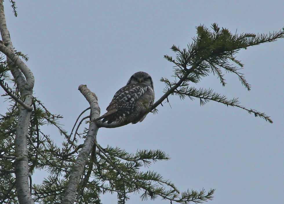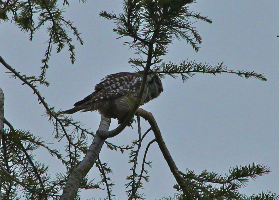 As luck would have it, the icing-on-the cake to a very good day was the sighting of the Northern Hawk Owl at the location we had searched on the way in. Several vehicles of birders were parked on the side of the road, and we found out the bird had just recently appeared. Unfortunately, the lighting was poor for photos, but we had excellent views with the scope.