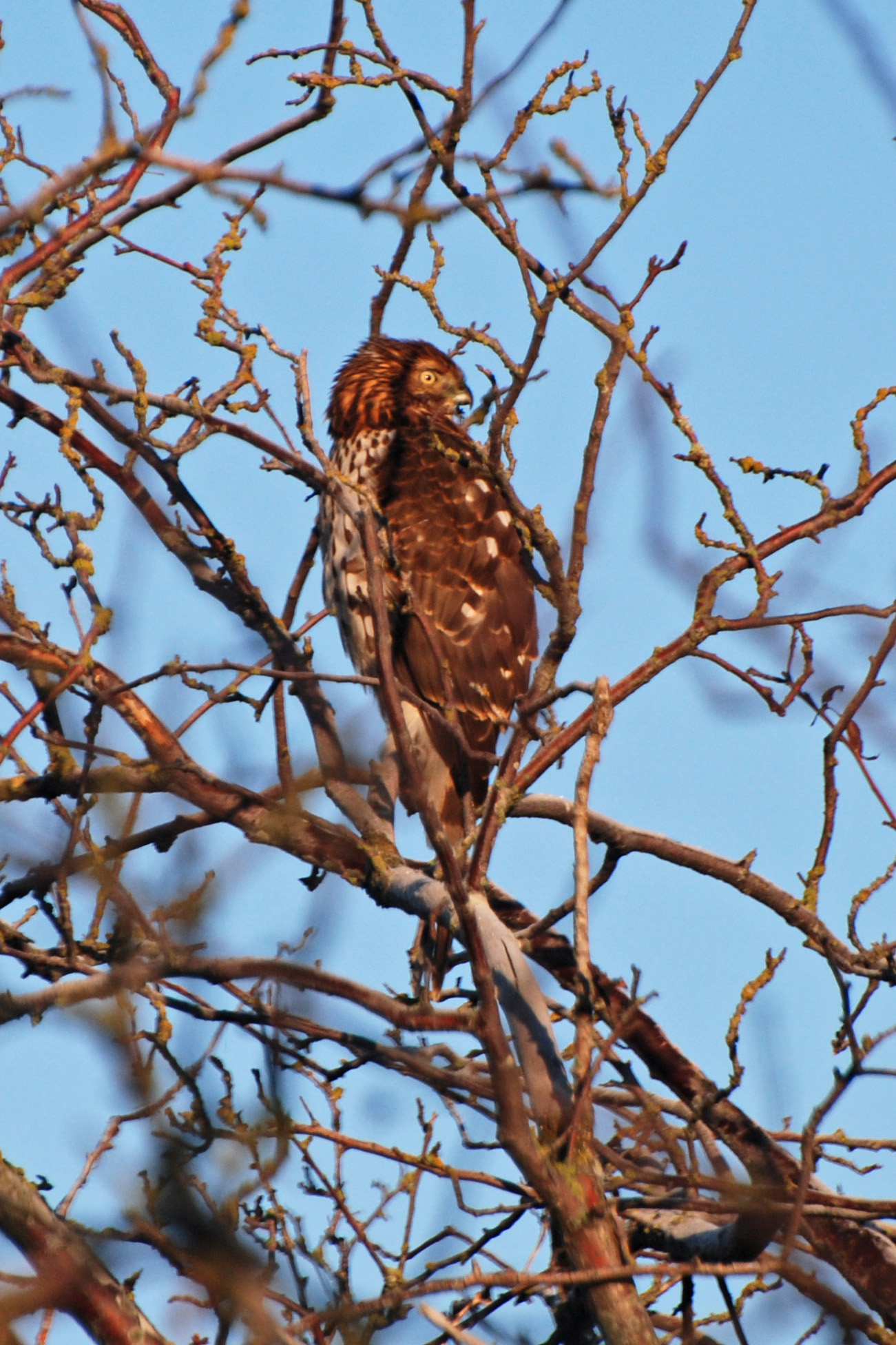 We started at the Kingfisher Bridge on the Tsawwassen First Nations (TFN) Reserve. The ponds in the fields were frozen but the water was running in the creek. No Kingfisher seen but a few Green-winged Teal, Song Sparrows and Roger spotted a Marsh Wren. In the bay toward the ferry and coal/container port terminals were thousands of ducks, a few swarms of Dunlin and lots of Great Blue Herons from their colony at nearby Tsatsu Shores, and of course many Bald Eagles. Along the TFN road were lots of other Sparrows (White-crowned, Golden-crowned, Fox) and House Finches as well as a Sharp-shinned Hawk, photographed nicely by Rochelle.