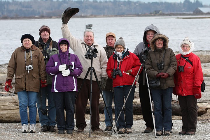 Near the parking lot at Blackie Spit was a flock of Gulls, mostly Ring-billed and Glaucous-winged. The water was high, but the several Common Loons, Horned Grebes, Common Goldeneye and Red-breasted Mergansers were not real close to shore, but easily seen.  Roger spotted a Red-necked Grebe.  We walked to the end of the Spit and, on the other side, hundreds of ducks were lounging; mostly American Wigeon and Northern Pintail.  We saw at least one Eurasian Wigeon.  Interestingly, we found two frozen dilapidated carcasses on the Spit; one looked like a Great Blue Heron, the other a Cormorant with a Tag (BC Beach Survey #2911), zip-tied to its leg.