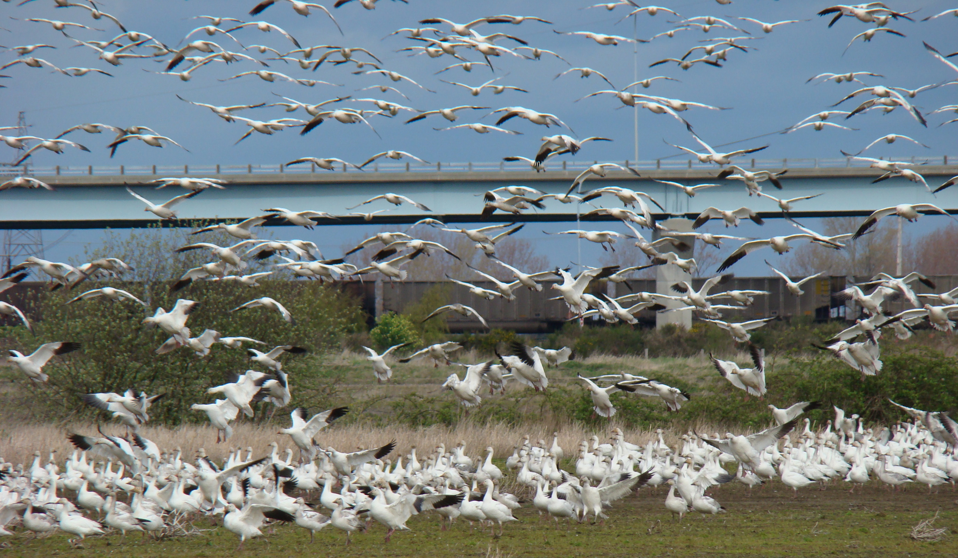 We started with our usual route to the Kingfisher Bridge in the Tsawwassen First Nations Reserve. As usual, the tide was low and the resident Belted Kingfisher was not seen. While enduring the customary wait for our wandering minstrel Roger to arrive, we watched the House Sparrows nesting in the street light pole and saw a few Green-winged Teal (GWT), House Finches, Barn Swallows and Northern Harriers. At the other end of the TFN Reserve we stopped to watch a flock of about 1500 Snow Geese feeding in a field. They entertained us with a brief circular flight, while four Greater White-fronted Geese remained feeding.