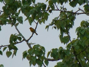 Not surprisingly, with several regulars off to the convention at William’s Lake and the damp morning, only four stalwart birders were present for our tour of the Boundary Bay Airport lands (the “North 40”). Mike and Roger met at Petra’s where Tom checked in to make sure we were going to fulfill our duty to keep the string of outings intact. At the 72nd Street entrance we found Marg and Rick waiting and, donning our rainware, we set off in search of exotic species. After a very quiet start we started to find the regulars; Golden, White-crowned and Song Sparrows, Black-capped Chickadees, and scattered “butter bums”. The latter was puzzling until we determined that Marg was referring to the Yellow-rumped Warblers. The highlight of the drizzling day was (sorry Lorna…we promised not to see anything interesting while you were away) Rick’s sighting of a Western Tanager. Apologies for the fuzzy photo, but it was quite a distance away and it was raining.