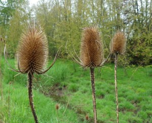 While birding was our main purpose we very much appreciated the variety of beautiful trees lining the streets, especially the willows, chestnuts, oaks, hawthorns and others. The “eagle tree” had mother on the nest but was difficult to see as our binoculars were fogging over in the rain. Just west of the nest there was a patch of Common Teasel, an uncommon weed (photo below) which can become a nuisance if not controlled.