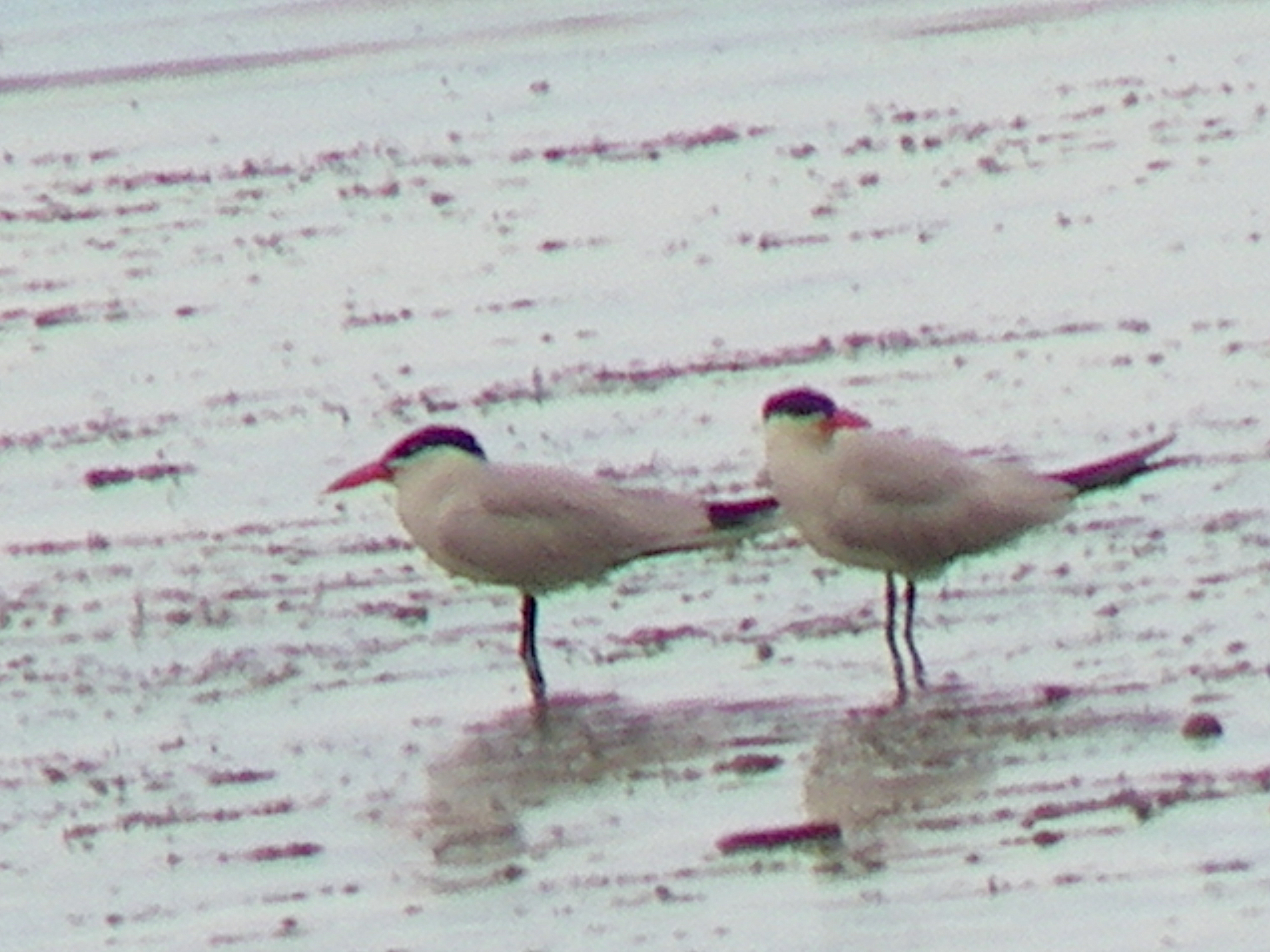 Leaving the ponds we paid close attention to the bird boxes along the river but found only one occupied by a Purple Martin family. Most seemed to be home to starlings. Back at the vehicles we were treated to wonderful peanut butter cookies provided by Marion! After the others left, Mike, Lorna and Roger went down to the beach where a Greater Yellowlegs was seen digging in the mud and some Caspian Terns resting on shore. At that point we met Richard Swanston who kindly explained, and showed us through his scope, how the banding on the tern legs is interpreted. Always an excellent learning experience when Richard is around. Thanks, Richard!