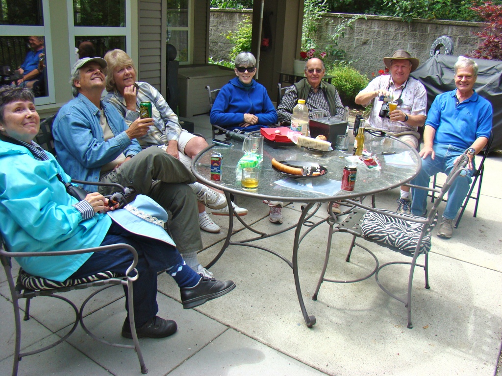A pleasant decision. As we sat around the patio table (again, see Ken’s shots), Rufous Hummingbirds, brilliant House Finches, American Goldfinches and Black-capped Chickadees frequented my feeders. Rick nearly broke his neck watching the soaring Bald Eagles above. A fly-past of two Pileated Woodpeckers surprised us, although I know that they (including at least one young bird) feed regularly at my neighbour’s suet (ignoring mine?). I drove the giddy group back to Petra’s shortly after Noon.