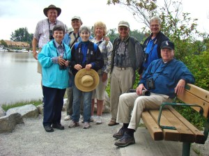 We parked opposite the historic Burrville House (built in 1906-remember Raymond Burr/Perry Mason?) and started our walk on the trail behind it. A Bat colony roosts in the back of this building. We hung around the two bridges in the grove between the Burr building and the Rowing Club Boat House; this has historically been a good spot for warblers and thrushes. As expected, we saw neither. We heard lots of singing Swainson’s Thrushes, Black-headed Grosbeaks, but could only find Song Sparrows and Spotted Towhees. We continued our walk along the slough-side trail, trying to avoid stepping in horse dung, through some nice grassland habitat, then deciduous trees to the grove of conifers (where I think the Great Horned Owls nested). We saw some gorgeous wildflowers (see Ken’s photos), heard more singing, and saw a couple of Northern Flickers and Cedar Waxwings. We took the obligatory Group Photo