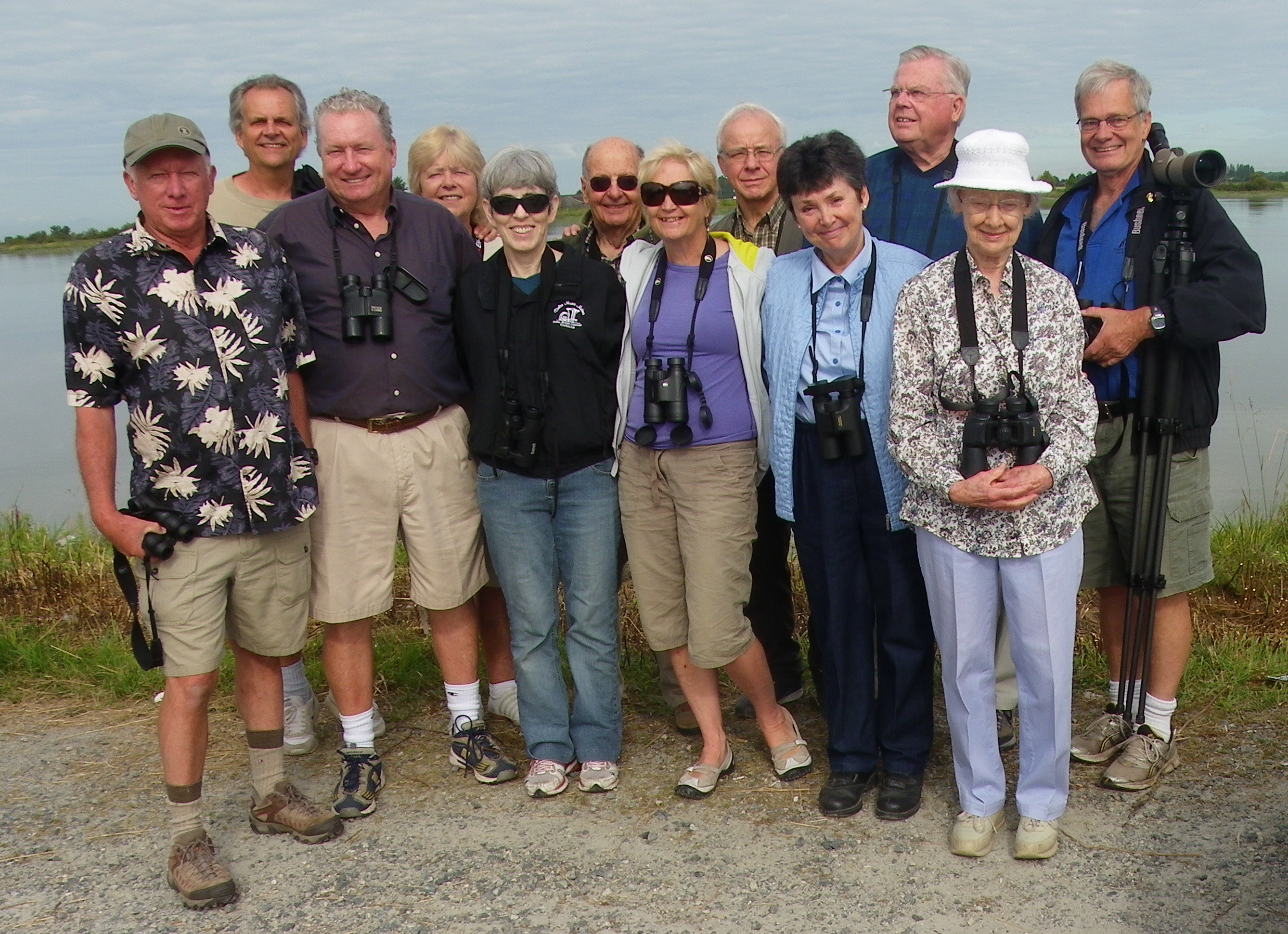 We drove through the Tsawwassen First Nations Reserve and the Ladner farmers’ fields to the Westham Island Bridge. Not much interesting seen other than more Red-tailed Hawks than we normally see, a few Eurasian Collared-doves, a Rufous Hummingbird, and David Bradbeer of the Delta Farmland and Wildlife Trust who was cruising the back roads and stopped to give us his spiel on what DFWT is conserving in cahoots with the local farmers (e.g. planting Clover to feed the wintering birds). Along the Reifel entrance road, some saw a Western Kingbird and a Belted Kingfisher while others were grooving on that elusive American Robin. Reifel Manager, Kathleen Fry briefed us on the latest interesting sightings (e.g. Great-horned Owl, Sora and Virginia Rail), of which we saw none. Since the tide was high, we decided to walk quickly to the Lookout Tower to see the Shorebirds. Of course, Roger and Hans-Ulf got lost. Along the west trail we saw lots of Cedar Waxwings, Brown-headed Cowbirds, American Goldfinches, Marsh Wren, Wood Duck and Gadwall families. At the tower, flocks of Dowitchers (both Long-billed and Short-billed, which a select few of us could differentiate) were close by, with lots of Peeps too. Some were able to identify the black-legged Western and Semipalmated Sandpipers and the yellow-legged Least Sandpipers. All of us could identify the eight Sandhill Cranes lounging in the outer pond, plus the Reifel family including the now-flying juvenile which flew in and “scared off” the eight interlopers encroaching in their domain. We also saw a Spotted Sandpiper, a few Yellowlegs (Greater and/or Lesser), several Killdeer, and the “Lost Ones” saw a Wilson’s Phalarope and a Sanderling, which they conveniently scared off before the rest of us got to that pond. A group (8-10 birds) of Hooded Mergansers were swimming among the Mallards, Gadwalls and Canada Geese. We left Reifel around Noon, most claiming to have had an enjoyable morning, despite the inane conversation, but the coup de grace was the stop at Emma Lea’s Farm on the way back to Petra’s where we each scoffed down a huge ice cream Sundae, loaded with freshly-picked Blueberries and Strawberries.