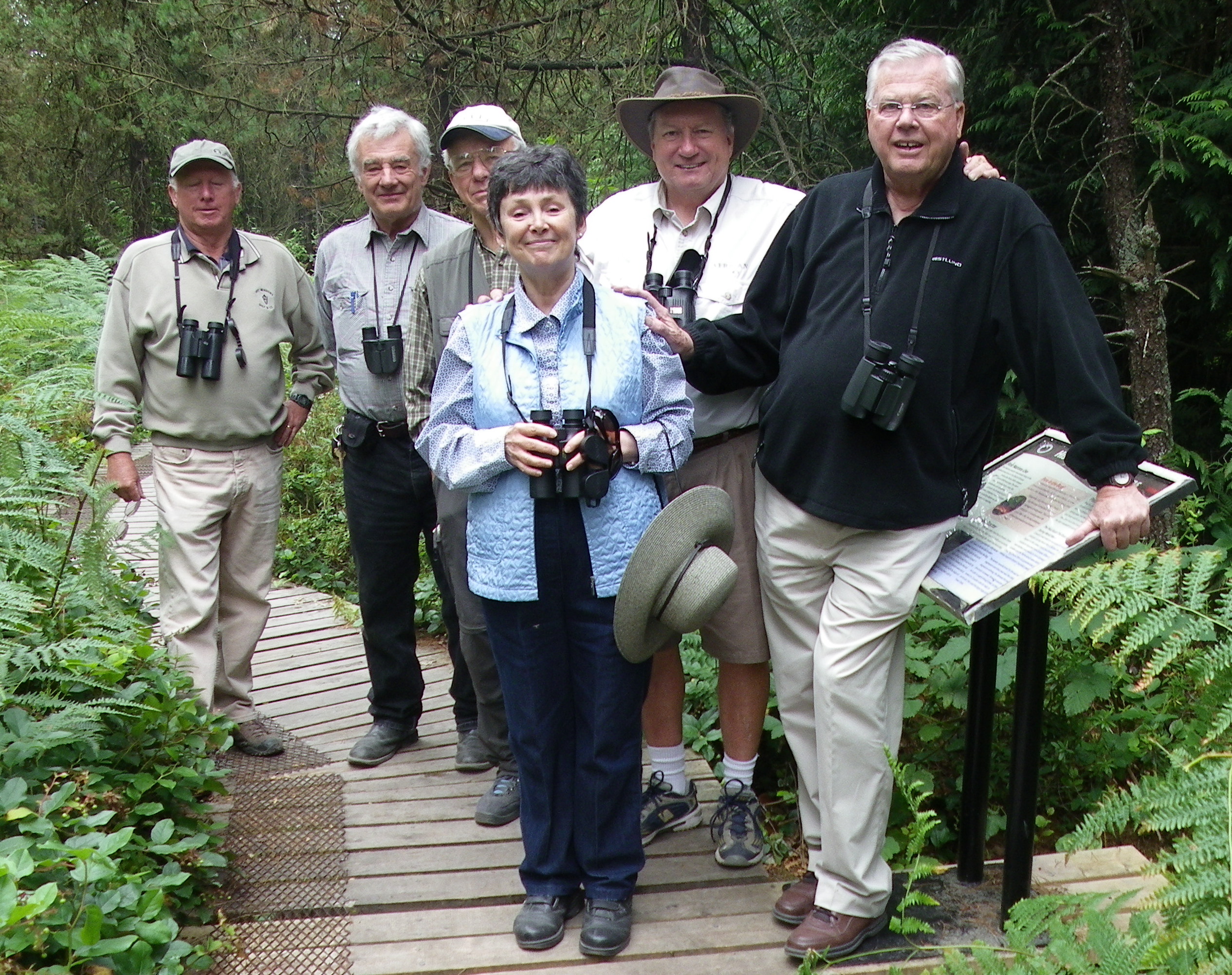 But our Biologist Roger and his trusty book-toting assistant Hans-Ulf, delighted us with the names and descriptions of many of the flowers and plants along the way. As usual, I have forgotten the names, but hopefully Roger will enter some along with his photos in our Blog. Since I missed breakfast at home this morning, the hi-lite for me was munching on five different Berry species which were all deliciously ripe and in abundance along the trail, including; Blackberries, Thimbleberries, Huckleberries, Blueberries and the most common Salal berries (actually tasted more like grapes than berries). We thought about making a pot of tea since the Labrador Tea plants (beautiful aroma) were everywhere too. I also tasted the inedible and sour Dogwood berries. As for birds, there was lots of woodpecker evidence, but we only saw a couple of Downies (spotted by our most ardent and jovial birder Lorna) and a Northern Flicker. Song Sparrows, the elusive American Robin and some tiny fish in the stream entertained us fleetingly. Not to sound too down on Burns Bog, on past trips there we have seen several Warbler species, hawks and falcon species, Pileated Woodpeckers, Thrushes, Flycatchers and a Northern Shrike. But not today. The Boardwalk was in excellent condition and the new Signage was very informative. Following a pit stop at the GPF Arena adjacent to the Bog parking lot, we each shared a bite of Lorna’s PB sandwich and some of Eleanor’s mixed nuts (with smarties). We returned to Petra’s before Noon, satiated from the excitement of such an exhilarating outing.