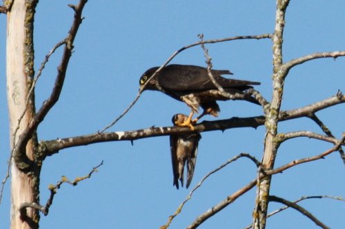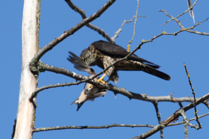 Eight birders (Terry, Hans-Ulf, Lorna, Marion, Gord, Alan, Mike and me) met at Alaksen National Wildlife Area (NWA) to begin a gorgeous Wednesday morning of birding on Westham Island. Hi-lites were: Willow Flycatcher, Yellow-rumped Warbler and a Merlin munching on a Barn Swallow, plus lots of Shorebirds at Reifel. Check out Terry’s action-packed photos on our Picasa site at: http://picasaweb.google.com/dncbirding and past reports and photos on our Blog at: http://dncb.wordpress.com/.