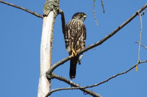 We all arrived at Alaksen at about 8:00 a.m. and spent the next hour being entertained by the “single tree” behind the Bird Studies Canada office. First Song Sparrows, House Finches and speckled, winter-plumage European Starlings landed in it. Then came a Rufous Hummingbird; then a few little Warblers, including a still colourful Yellow-rumped (Audubon) and a Common Yellowthroat. Cedar Waxwings were posing at the top when a Willow Flycatcher snuck in at the bottom. We checked out the lane for owls (Barred, Barn and Great Horned nest at Alaksen), in vain of course. A Northern Flicker’s red shaft shone as a Cooper’s Hawk flew by, then a Red-tailed Hawk. We returned to the “Tree” to watch a Merlin snatch a Barn Swallow and enjoy his breakfast right in front of us. You can see a photo sequence of the Merlin Meal episode (Terry took 600 shots on the outing including 200 of the Merlin) on our Picasa site.