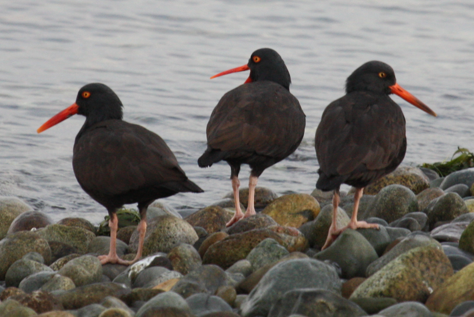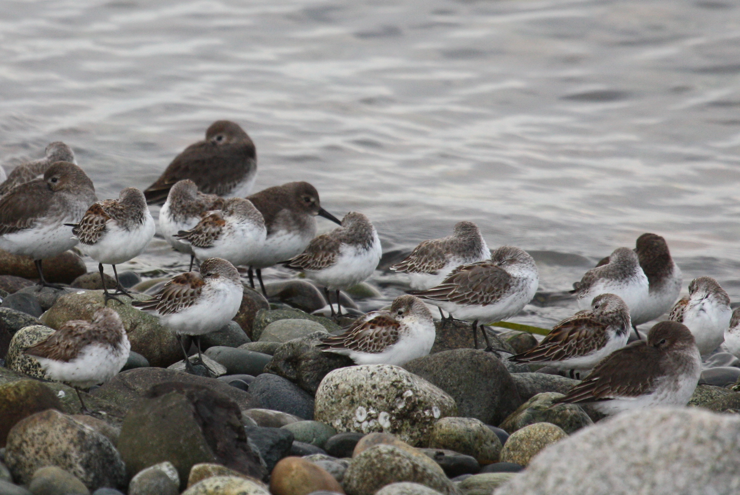 First stop was at the “birders pull-off” on the causeway just before the entrance to the Tsawwassen Ferry Port. Hundreds of Horned Grebe were diving close to us while the spit was covered with Northern Pintail, American Wigeon, Double-crested Cormorants, Mew and Ring-billed Gulls among the Glaucous-winged, and interestingly, only two Mallards. The ducks were briefly spooked as a Peregrine Falcon gave us a neat fly-past. A bit further back along the shore, we watched 11 Black Oystercatchers foraging under rocks. Next to them was a huddled flock of Western Sandpipers with about a dozen Dunlin surrounding them. The sun was behind us and we got great views, up-close-and personal, especially as the flock (~100) swooped in front of us several times. Common Loons, White-winged and Surf Scoters, and Scaup species were among the thousands of ducks in the Bay/Strait. We moved on into the Ferry Port where the Black Turnstones are regularly seen. Several roosting there as an inquisitive Harbour Seal eyed us closely. On the way out, we checked quickly for the resident Harlequins and Willet, but didn’t see them. Not much seen through the Tsawwassen First Nations reserve, other than some White-crowned and a Song Sparrow that almost looked like a White-throated Sparrow.