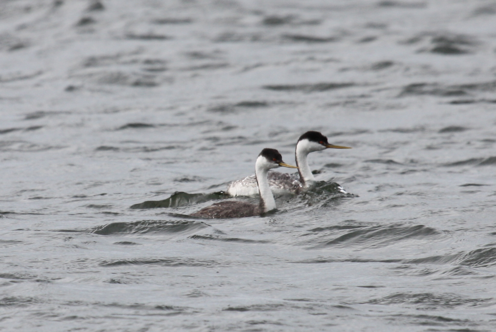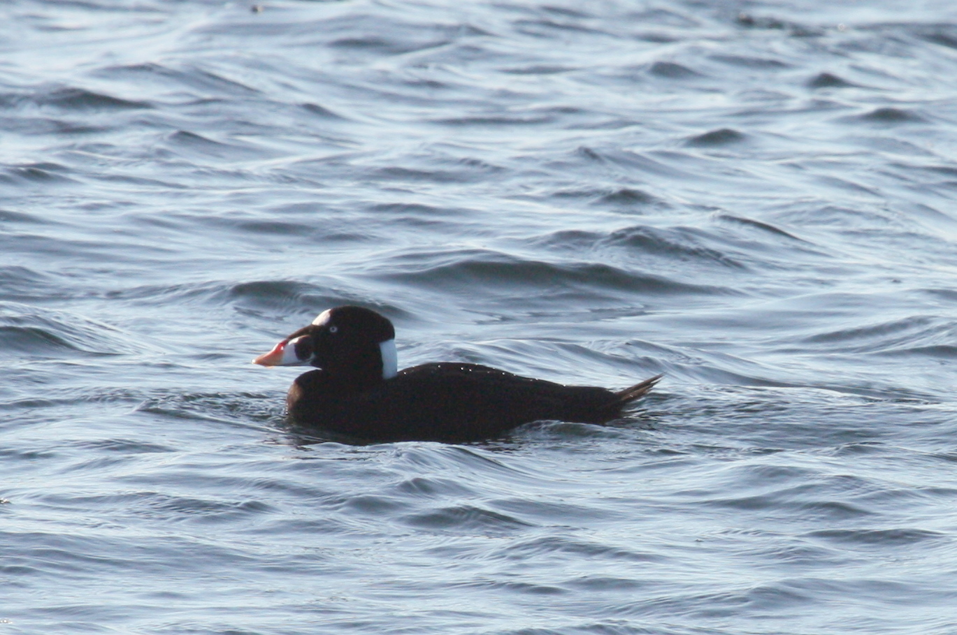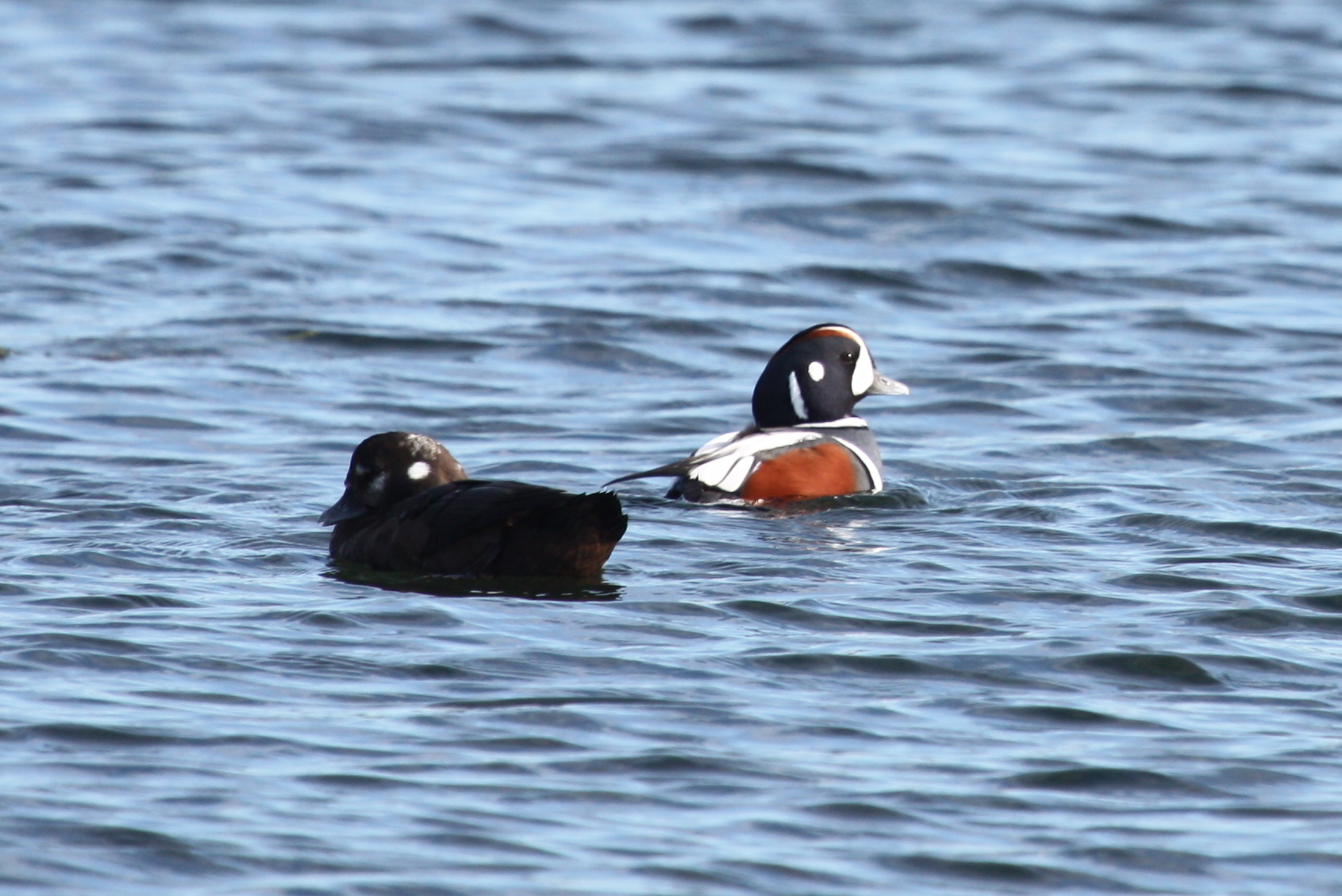 The tide was high when we arrived at Lighthouse Point Park, and we only had one scope to share among this large group. Fortunately, especially for our photographers, some Common Loons, Horned Grebes, Double-crested and Pelagic Cormorants, beautiful Harlequin Ducks in breeding plumage and Surf Scoters were quite close to shore. Further out we saw a few Red-necked and lots of Western Grebes. There were many other “sea birds” out there which looked like Common Murres, Marbled Murrelets and perhaps Pigeon Guillemots, but I’m only guessing from what I have seen there on previous visits and from what others have reported seeing there recently. A flock (25) of Shorebirds flew by in the distance, probably Dunlin, but we did not see any along the shore. Along the walk to the Point, a few Sparrows, White- and Golden-crowned, gave some of us neat looks. Among the Gulls, I am fairly certain I saw two Heermann’s Gulls, as well as several Bonaparte’s. Between Lighthouse Park and the Marina, we stopped at the pond which was full of Scaup (probably Lesser, possibly Greater too), a few American Wigeon, Mallards and at least one Blue-winged Teal (not common here). At the Marina, a Belted Kingfisher welcomed us on a post. A Northern Flicker was also foraging in the rocks as were a number of House Finches. More gorgeous Harlequins near the shore, and a Red-tailed Hawk in a tree near to where they habitually nest.