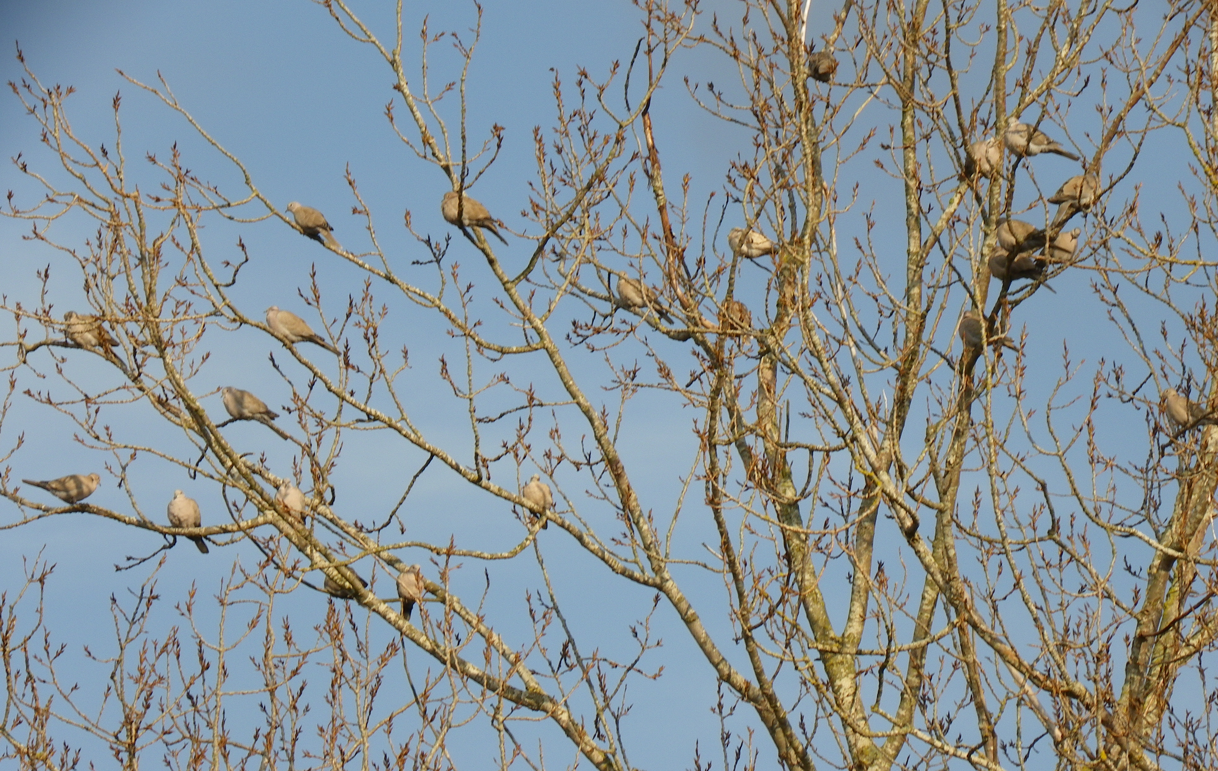 At this point, Ken and Anne left us and we decided to head to 72nd since a few of us hadn’t seen the Snowy Owls yet. We had great success there with Hans counting fourteen with one only 20 meters off the trail affording great photo oportunities. Also, on the farm side of the trail two Short-eared Owls were patrolling and occasionaly interacting with the Northern Harriers. Driving back along 72nd we sighted a tree with more than twenty-one Eurasian Collared Doves and many more on the wires above (Double-click on the photo to enlarge it).