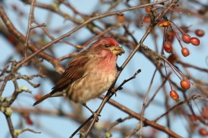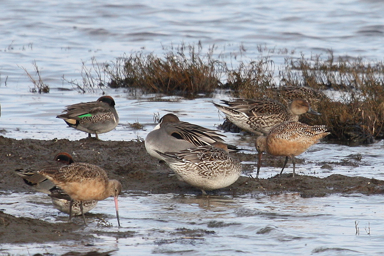 Having exhausted White Rock we moved on to Blackie Spit where the high tide had forced the water birds to the upper shore line. Here we found large numbers of American Wigeon, with a few Eurasian. Terry found one exhibiting hybrid characteristics of the Eurasian and American. There were lots of Pintail, Green-winged Teal, Mallards, Double-crested Cormorants and three Marbled Godwits and some several Western Grebe. A few Greater Yellowlegs were at the far west end of the waterway to the south. In a Crab Apple tree we sighted a number of what we thought were House Finches but were actually Purple Finches. We spent some time observing and learning from Anne how to separate the two species, something most of us always have difficulty with. A highlight was the sighting of a small group of Evening Grosbeaks feeding on Crab Apples. Terry managed to get photos of them, including a beautiful male, with perfect lighting. What was exciting was that very few Evening Grosbeaks have been seen in recent years where in the past large flocks were common in the winter months on the lower mainland.