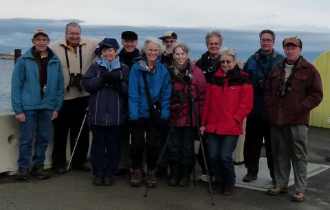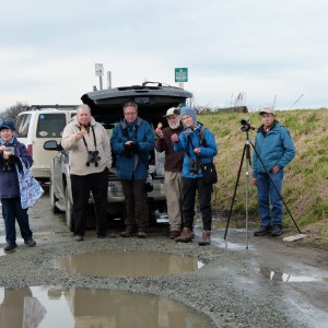 Our three car convoy left Petra’s shortly after 8:00 a.m. First stop was the pull-off on the causeway at the entrance to the toll booths at the Ferry Port. The tide was very high but there were only hundreds of birds in the Bay, not thousands that we saw on our outing there before Christmas. Lots of Mallards and American Wigeon, and the neat “plumaged” ducks seen were Bufflehead, Common Goldeneye, Red-breasted Mergansers, Surf Scoters, Common Loons, Northern Pintail, Green-winged Teal, Scaup, Horned Grebes and a posing Black Oystercatcher. We drove through Tsawwassen First Nations (TFN) reserve and the farmers’ fields toward the Delta Container Port, stopping to check out the many feeding Trumpeter Swans but not seeing any Tundra’s this time. Roger’s car saw the first of three Peregrine Falcons on the TFN property, also Northern Flickers, Golden-crowned Kinglets and Golden-crowned Sparrows. We parked legally, for a change, at the Deltaport Tug Harbour where lots of the same species we saw faraway at the Ferry Port were up-close-and-personal here. Lorna’s Harbour Seal surfaced for us and a friendly Security Guard took our mandatory Group Photo.