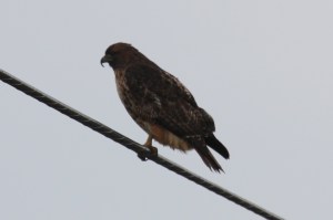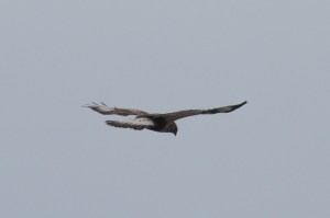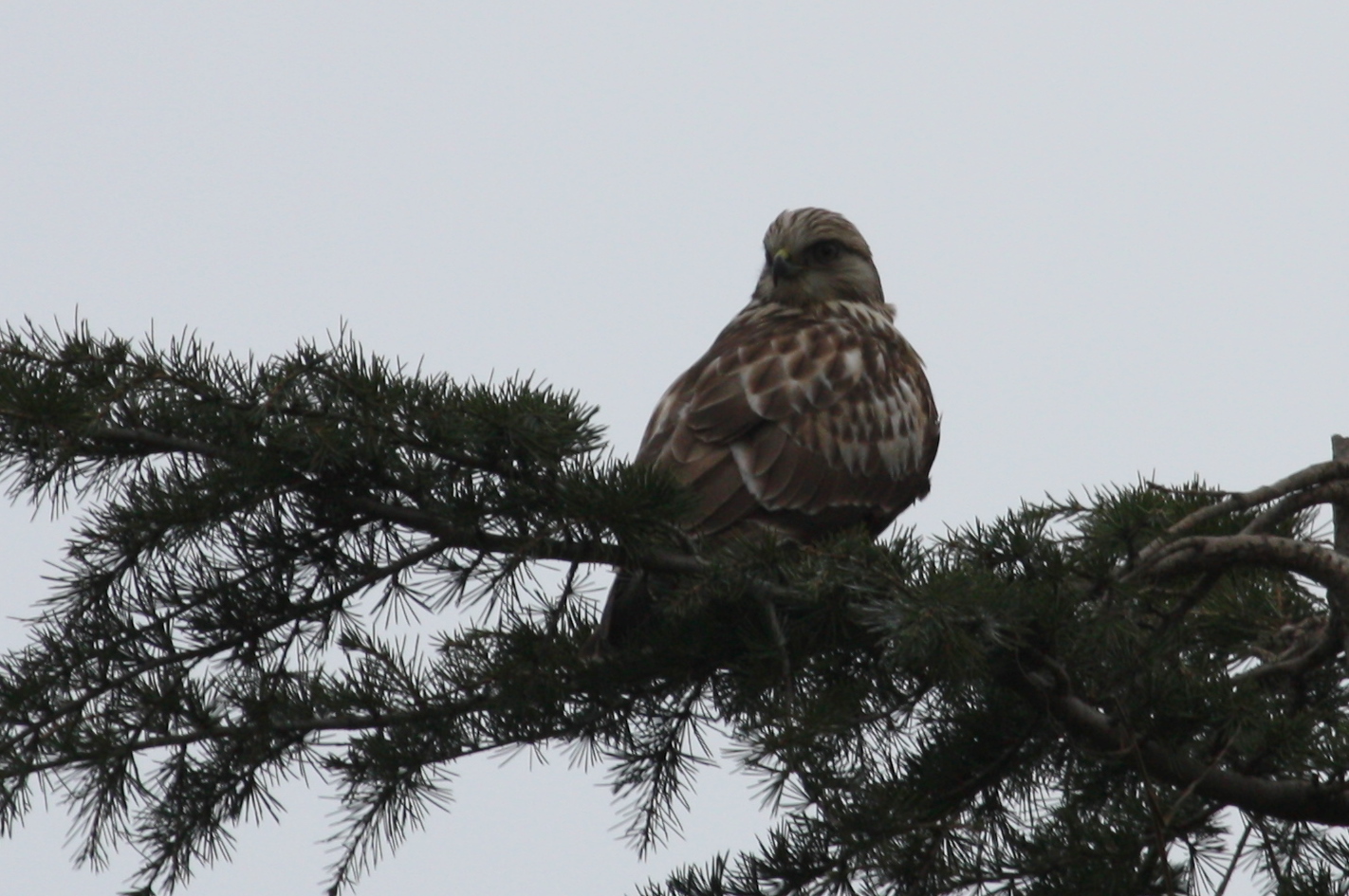The four Newbies were almost impressed. In the Fraser River, the new species we saw were a few of the resident Canoe Pass Mute Swans (first year birds) begging for food, and a Common Merganser. Lots of Double-crested Cormorants, Bald Eagles, Northern Harriers and Red-tailed Hawks around, one RTH with a very long weird bill (see photos). A couple of dogs were chasing birds in a field near the road at the Brunswick trail entrance, and the birds were a few gorgeous Western Meadowlarks. We walked the dike path toward the Snowy Owl hangout area and we counted seven beauties in the marsh, plus two of Lorna’s “Trumpeter Snowies”. We were also enthralled by the fly-pasts of at least two Short-eared Owls, who on occasion would fly directly into one’s binocular view. I never get tired of seeing an owl’s face flying right at me. Before getting in our vehicles to leave Brunswick, a Rough-legged Hawk landed on a barn, then moved to a Pine Tree, for a photo shoot. Then on the way back to Petra’s we stopped to see what we thought was a Peregrine Falcon on a telephone pole near the Musqueum dumpy place on 34th Street – it was a Gyrfalcon (which I had been searching for in vain all Winter). We saw two more Peregrine Falcons; one on a hydro tower at the new Deltaport Road overpass and another on a fence post near the turn onto 52nd Street. So we saw lots of neat stuff and as usual, the comradery and conversation was very close to being interesting and entertaining.