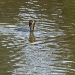 Walking towards the golf course we picked up a Downy Woodpecker, Common and Hooded Mergansers, several Double-crested Cormorants, Mallards, American Wigeon, and in a feeder at the back of one of the houses were a number of American Goldfinches. Also at the feeder were a number of European Starlings, House Sparrows, and Dark-eyed Juncos. I hope Tom doesn’t mind my pointing out the fourth hole trees that are a favorite target for his errant drives. On the way back to the cars we were treated to the sight of one of the cormorants trying to gulp down a fairly large fish (carp?).
