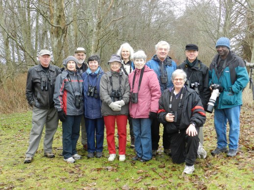 Bryan and Janet were able to locate a Brown Creeper and Hutton’s Vireo by sound, Bryan using a frequency altering BirdFinder device which allows one to hear the higher pitched songs reduced to an audible level (correct this, Bryan, if I’ve got it wrong…Roger). Walking along the trail to the river we encountered a large flock of Pine Siskins with some Common Redpolls mixed in with them. Always difficult to see because they are so high up in the trees and constantly flitting, it was difficult to pin-point the Redpolls and only about half of us managed a reasonable look (any photos anyone?). On the river, and at a considerable distance, we were able to make out two Red-throated Loons, a Western Grebe, Red-breasted Merganser, and a number of Buffleheads. A few Red-tailed Hawks were seen and, of course, a number of Bald Eagles. Ken took our customary Group ( I’m sure I said “Group” and not, thanks Ken, “Grope”! …Roger) photo.