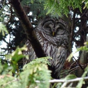 From the slough we drove directly to Alaksen, slowing down only to look at the Ring-necked Pheasant sighted by Eleanor, and on getting out of the vehicles were greeted by two Barred Owls calling to each other. A brief search by Ken lead to some great views of one of them.