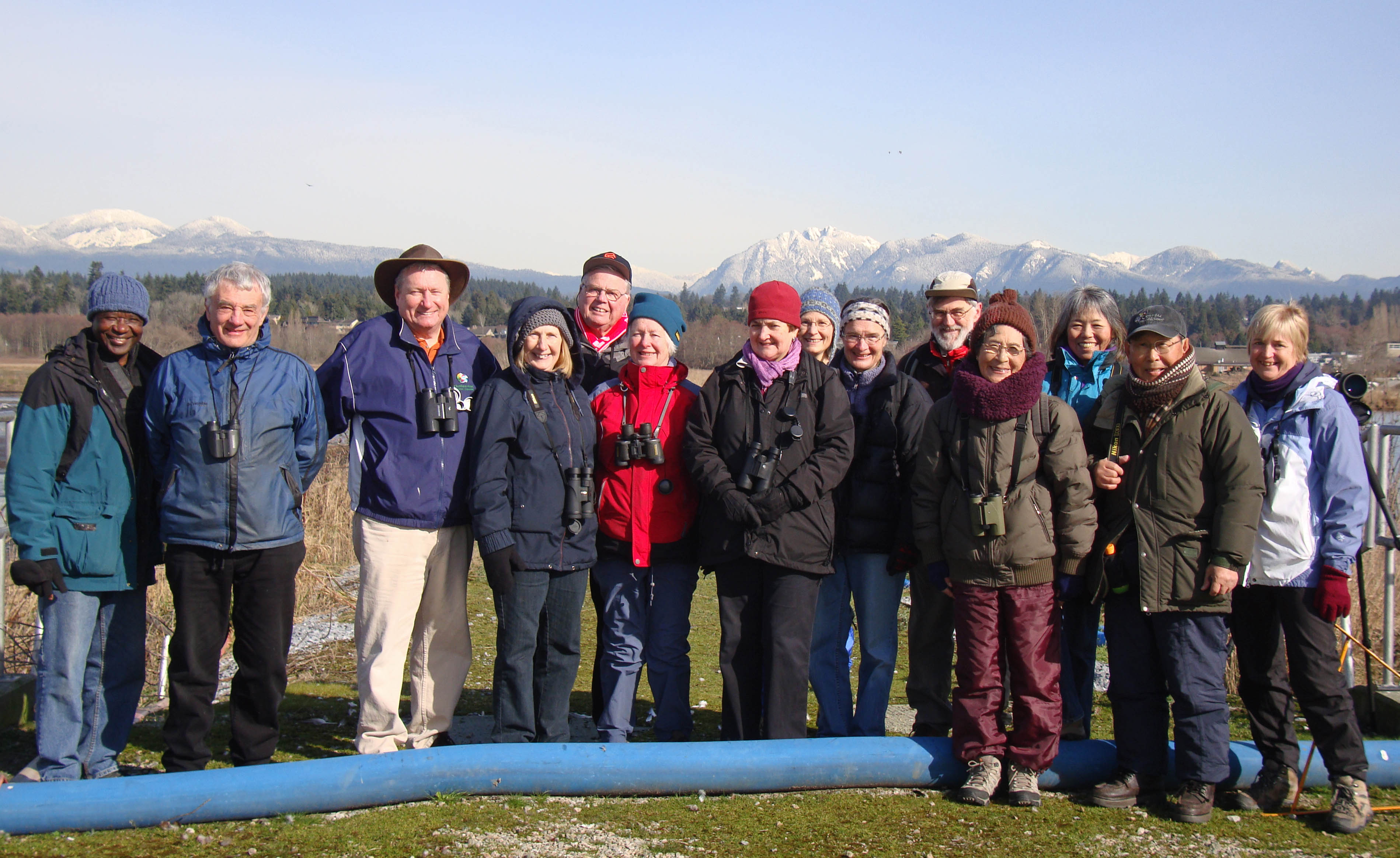 On entering the back door to the Sewage Lagoons, lots of ducks were up-close-and-personal; Northern Pintail, Northern Shoveler, Gadwall, Green-winged Teal, American Coots, American Wigeon and Mallards. Mew and Thayer’s Gulls were in predominant numbers there. A Killdeer was foraging in the mud and then, among the Red-winged and Brewer’s Blackbirds, we spotted five Western Meadowlarks, a couple of which flashed their brilliant yellow chests in our bins. We heard several Marsh Wrens and one finally popped up to give us a good look. Jonathan, and Satchmo, took the obligatory Group Photo, with the snowy Cypress/Seymour/Grouse mountain back drop. The walk back along the busy-with-tug-boats Fraser River produced a few Barrow’s Goldeneye, both Red-breasted and Common Mergansers, and a Peregrine Falcon perched on a stump on the other side. I was told, surprisingly but happily, that this was one of several Lifers seen by our Japanese visitors on the day. We searched in vain for a Northern Shrike, but were pleased when a flock of “gulls” on the other side that direction-and-time-challenged Marian spotted, turned out to be Snow Geese. A couple of Northern Harriers cruised by, as did several Double-crested Cormorants and several Baldies. We returned to the parking lot at about 12:30 p.m. where the “vultures” (aka DNCBer’s) wolfed down my Cammidge House Heritage Day left-over home-made cookies, as well as the Japanese visitors’ friendly biscuit offerings.