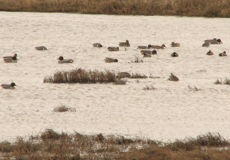 A few (3) Sanderling were foraging on the shore right in front of us. Several Green-winged Teal around too, and we found the one Common (Eurasian) Teal that Tall Rick S. had reported seeing on several occasions (see Bryan’s photo below & on our Picasa site).
