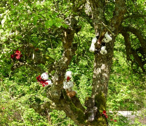 Roger led us on his private trail to the Bear Tree.  The single bear he originally discovered last year had inexplicably gained eight more brothers and sisters in the tree (see Roger’s photo).Then he showed us the spot where last week he saw and photographed an old moss-covered cabin, but it was gone the next day (the Park is a popular site for making movies).  A Red-tailed Hawk was sitting on its nest while the other (future) parent was hanging around nearby.  They both screamed when a Merlin flew by.  A Fox Sparrow (resembling a Hermit Thrush to some) scraped the ground under a bush while others saw a “Cow Bird-like” Red-winged Blackbird. Before leaving the Park, the starving of us wolfed down slivers of Lorna’s PB sandwiches and Marion’s un-named Trail Concoction.  It was a fun morning with a real eclectic group of weirdoes.