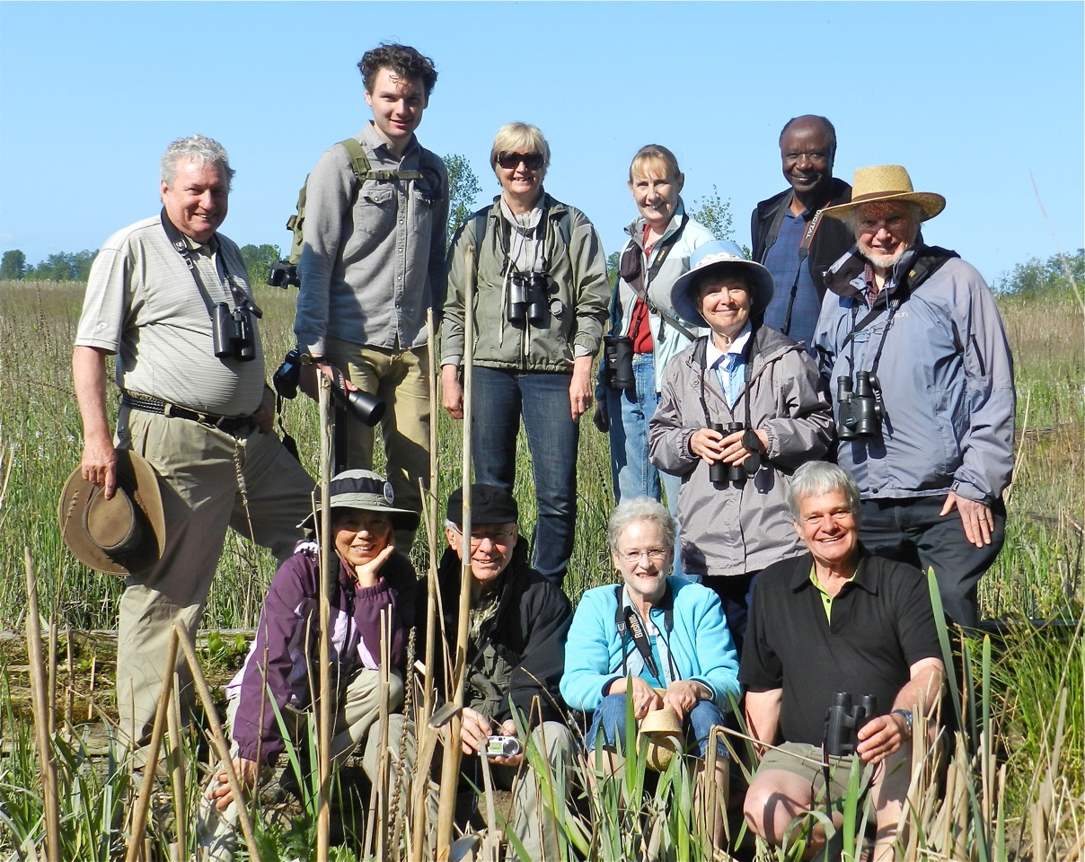 At the Lookout we heard both Bewick’s and Marsh Wrens but I’m not sure whether anyone saw them. The south arm of the Fraser River looked very inviting as we cased two BC Ferries docked for repair in their yard on the other side. Both Tree and Violet-green Swallows swooping around and White-crowned, Savannah and Song Sparrows singing. Ken took the mandatory Group Photo at the base of the Lookout. A resident Red-tailed Hawk gave a fly-past. On our way back, most people got good looks at (and photos of) a Western Tanager, while others missed it as they were trying to find an elusive Brown Creeper. Then several of the noisy Black-headed Grosbeaks finally gave us good views. Lorraine “followed” a Cooper’s Hawk along the fence trees; Cooper’s Hawks nested in this park a couple of years ago.