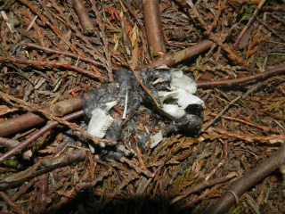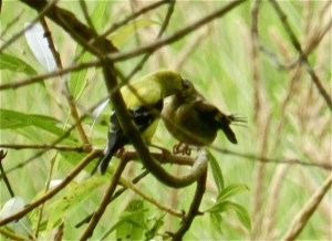 We followed a new trail (to me), past the mist net set-ups, along a creek where we saw a few Mallards and Wood Ducks. A sleeping Raccoon in the crotch of a tree was an interesting sight. Large mixed flocks of Starlings and Red-winged Blackbirds were in the marsh with the occasional Brewer’s Blackbird there too. A few Yellow-rumped Warblers seemed to be raised up by these marauding birds. A Marsh Wren was building a nest in the reeds. Some saw a Brown Creeper and heard a Red-breasted Nuthatch and Brown-headed Cowbirds. Ken finally got an action photo of an American Goldfinch feeding a youngster.