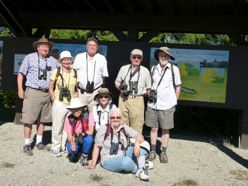 We got to Reifel just before 10:00 a.m. so we had 1 ½ hours to roam there before having to leave to meet violinist Bryan’s early afternoon “work” commitment. The water was low in the ponds; many Greater and Lesser Yellowlegs (neat to distinguish the species by size) were near the entrance building. Four baby Barn Swallows, snuggled together in their mud nest, stared at us as they waited for parental food. One Black-crowned Night Heron was perched in a “regular spot”. We posed at the Reifel information signage for Bryan to take the mandatory Group Photo; he’s even slower than Roger at setting up. We walked the east dike trail to the viewing platform. Some participants illegally gorged on blackberries while others enjoyed the two Red-breasted Nuthatches flitting above us, then landing on a trunk upside down as two Brown Creepers landed on a neighbouring trunk climbing up. Interesting reverse habits of these two species. We also saw several Warblers, which we think were Yellow-rumped and Orange-crowned (we’re still casual, not professional). A few Wood Ducks, although not yet in their nice plumage, are always nice to see.