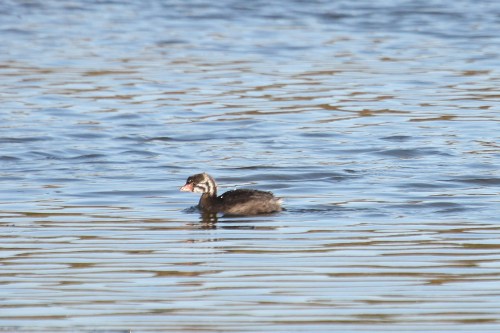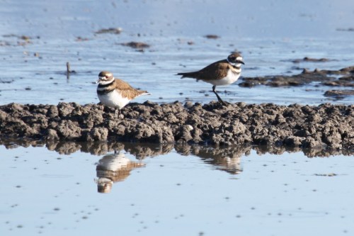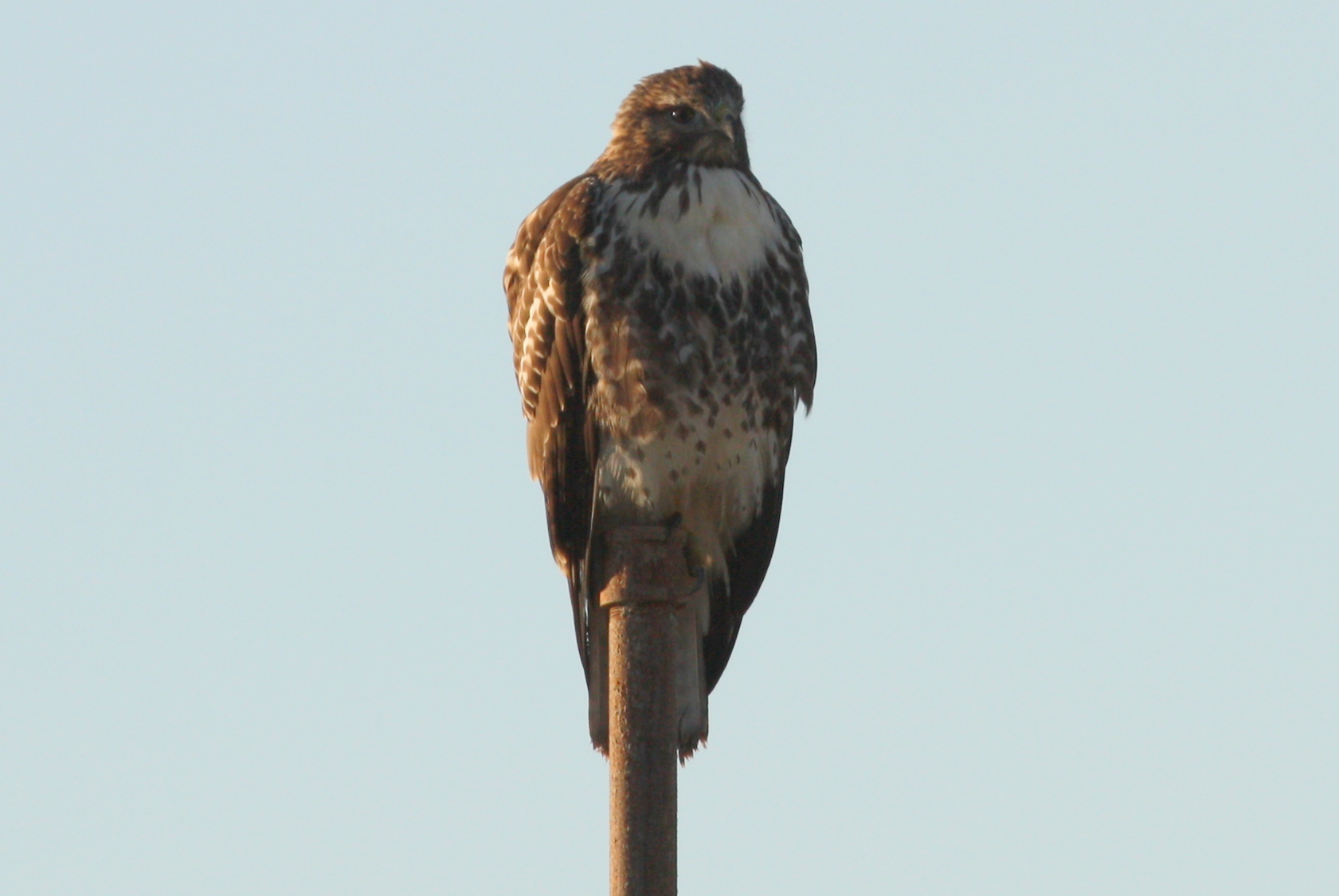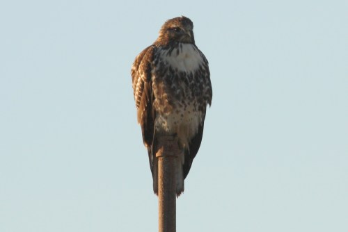 We entered the back gate into the Sewage Lagoons and were a bit surprised/disappointed at the lack of Shorebirds in the ponds. There were several Killdeer and Ring-billed Gulls in the first pond. As we wandered around the four ponds, we saw several other Peeps, and spent an inordinate amount of inarticulate discussion trying to ID them. I’m fairly certain we saw Least and Western Sandpipers, perhaps Semi-palmated. Marion’s Pectoral Sandpiper with two Dowitchers (Long-billed?) were foraging in the mud among some ducks. Check out Terry’s photos for ID confirmation. A small Hawk (Cooper’s/Sharp-shinned?) disappeared too quickly below the bushes toward the river as it was being mobbed by Crows.