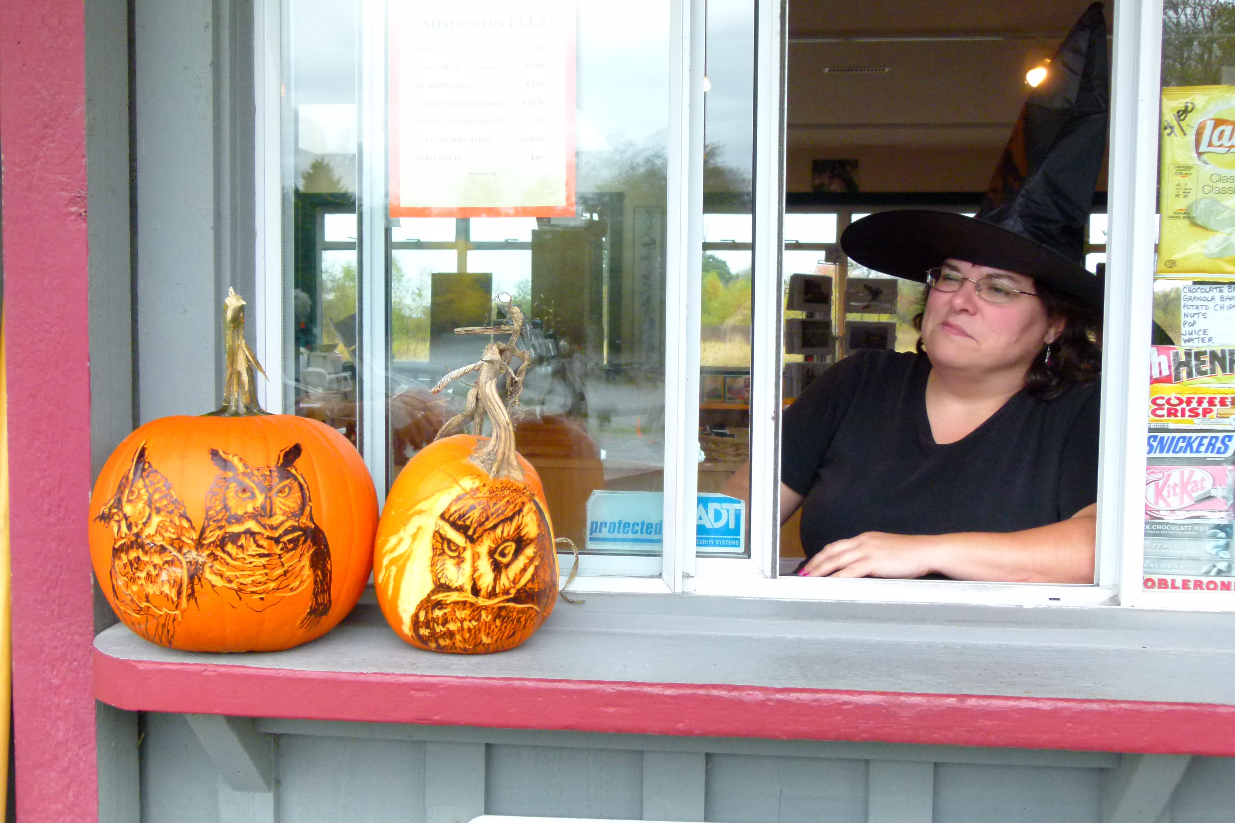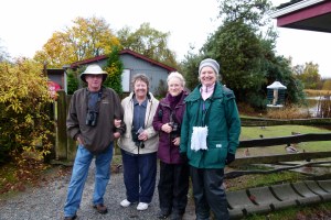 At Reifel we encountered the usual suspects but highlights included watching a Rough-legged Hawk hunting over the marsh…hovering, dropping lower, hovering again, and finally dropping on its prey! We had a large flock of Pine Siskins fly over as well as one of Cedar Waxwings. Rose spooked a Wilson’s Snipe and was disappointed that it wouldn’t sit still for her to get a good look at it. Also, there were large numbers of Golden-crowned Kinglets, and enormous numbers of Mallard Ducks including two Mallards fighting a squirrel for some peanuts. We had one Cooper’s Hawk, several Northern Harriers, one Bald Eagle and no owls. The only shore birds were a group of three Long-billed Dowitchers. Back at the entrance we found the resident Sandhill Cranes doing their mating dance which Rose managed to video. Laura, dressed as a witch, conjured up two more members for us… Marion S and her friend, Marti, from Lasquite Island, and then turned them into pumpkins (see photo).