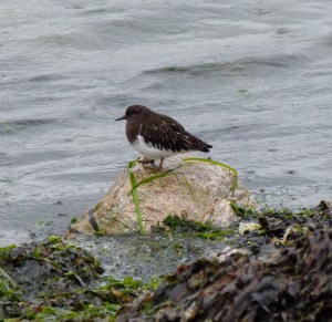 Yes, I’m wet and cold! A Rough-legged Hawk was sitting in a tree beside me though so the time wasn’t wasted. With no sparrows appearing I called my wife and invited her to be wet and cold as well resulting in the group doubling in size. Returning with Rose and narrowly avoiding a head on collision with a container truck on Delta Port Way (the shriek hit 9.9 on the Roseometer) we re-visited the ferry jetty where we had a close look at a flock of Black Turnstones.