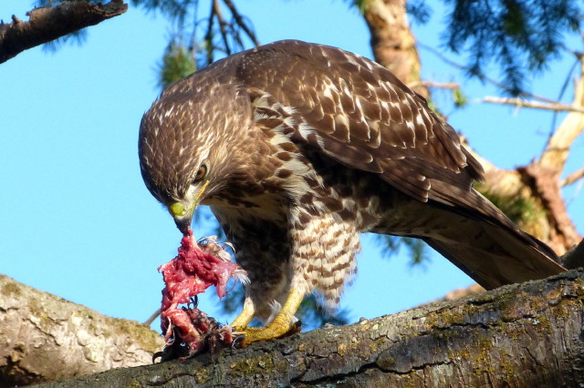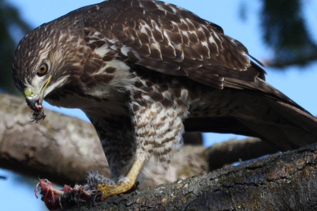 A school group, and a group from Pender Island, led by Al & Jude Grass, took the path to the right, so we went left. On a branch above the path, a Red-tailed Hawk was calmly dining on a duck as we took his photo.