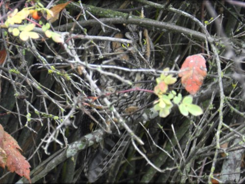 Terry’s subgroup returned to the parking area early, where Lorna found a Long-eared Owl heavily obscured in the shrubbery. Terry went back to tell Kay’s subgroup, still loitering to spot Kay’s elusive Short-eared Owl. Eventually the SEOW flew up and off to another location, so we quickly returned to the parking lot for excellent views of the rarer LEOW. Then, unfortunately, a stranger with a camera caused the owl to retreat further back in the bush.