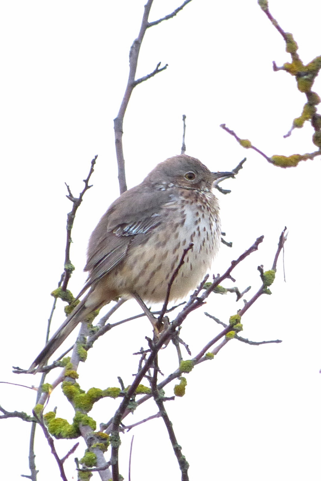 We left Petra’s around 8:00 a.m. for 64th Street in search of the Sage Thrasher. The water was as high as we had ever seen it, almost right up to the dike (a King tide), so there was a thin line of above-water foraging area on the Bay side of the dike. We walked east and spotted lots of neat little birds including: Yellow-rumped Warblers, an Orange-crowned Warbler, Ruby-crowned Kinglet, Lincoln’s, White-crowned, Fox and Song Sparrows, Purple and House Finches (which a number of participants could differentiate), but no Sage Thrasher.