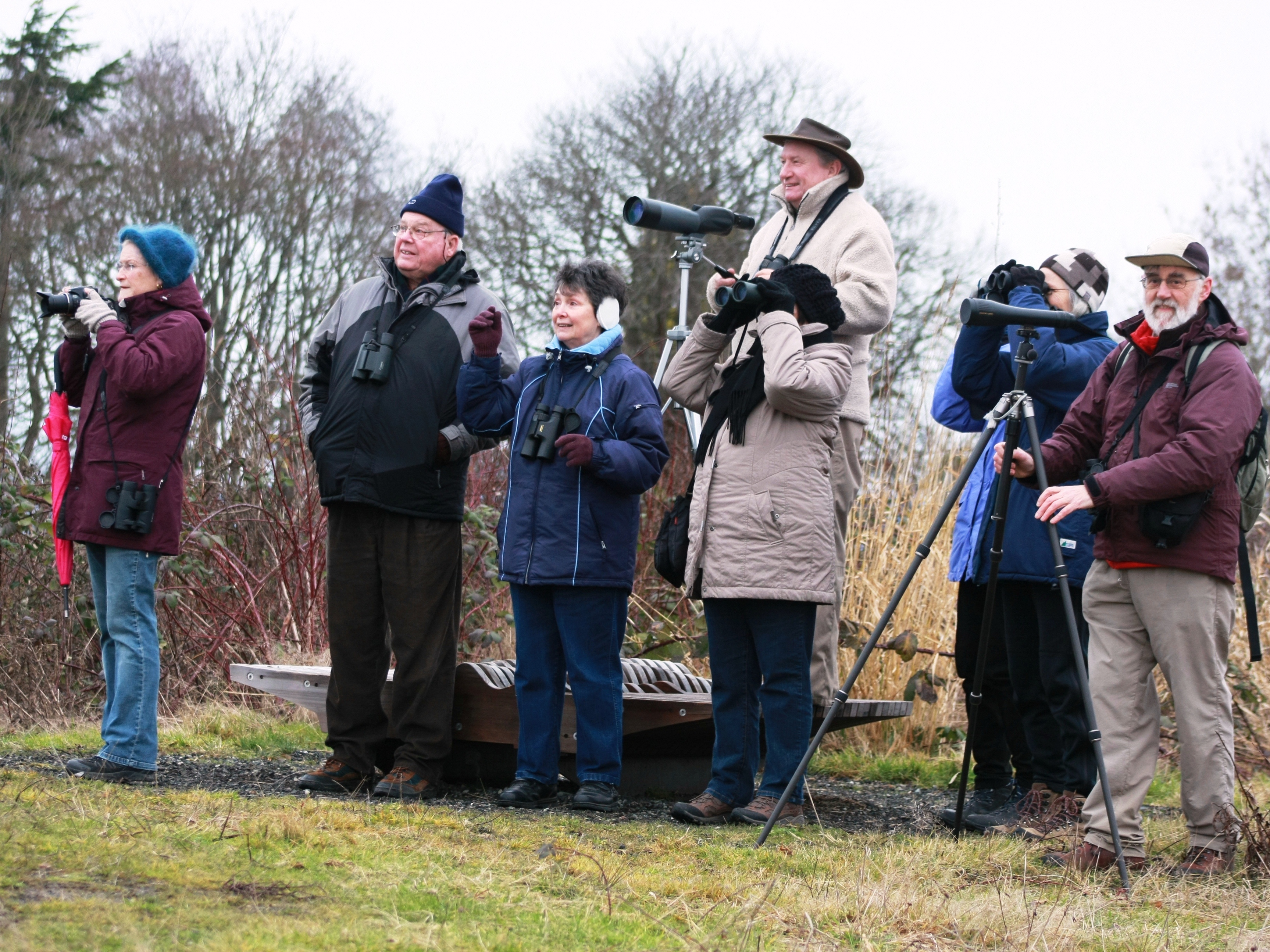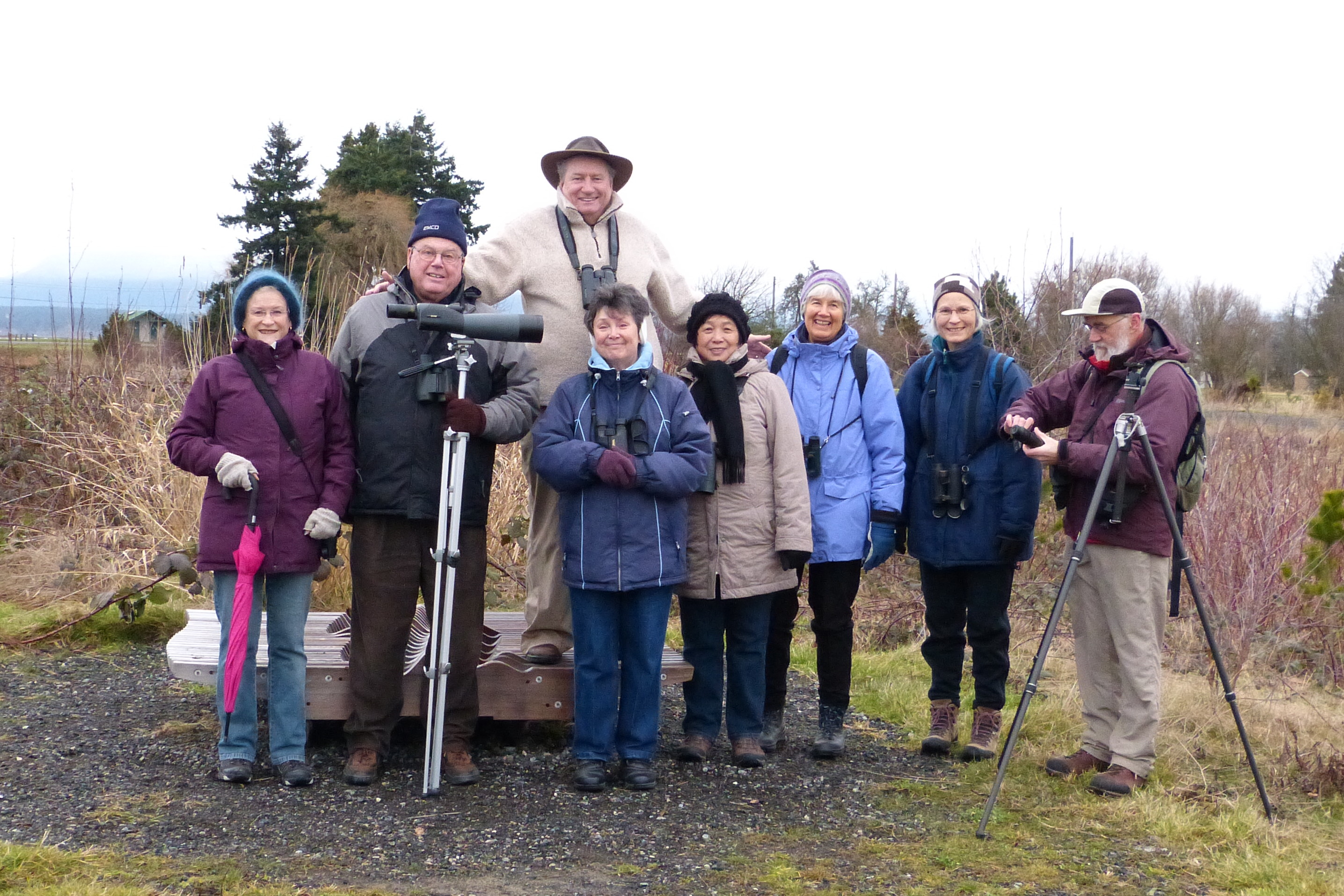 Four of us (Lorna, Sheila, Gerhard and me) left Petra’s around 8:00 a.m. and following a pleasant and quick drive via the HOV lane, we met the other six at the Terra Nova Park parking lot near the washroom on the dike path. We chatted “inanely” a bit and then scoped some Red-breasted Mergansers in the Fraser and one or two Horned Grebes. It was overcast and pretty chilly on the dike path and Wimp Gerhard garbled something about being cold and not having proper clothes, so he left. Before departing, and following his desecration by most DNCBer’s, he surrendered to us his Smoko Pastry. We walked the dike path for a bit, scanning the hordes of Red-wing Blackbirds, and also seeing Song and Golden-crowned Sparrows, Spotted Towhees, both House and Purple Finches, Juncos, Robins, Starlings in both winter and summer plumages. In the marsh were several Bald Eagles, Northern Harriers and Great Blue Herons. We saw some Snow Geese in the distance, and later on hundreds (perhaps thousands) flew over us in small flocks toward inland fields I suppose.