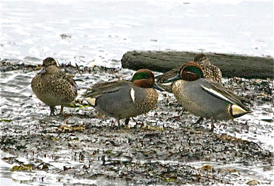 They were more interested in the Northern Flickers and Red-tailed Hawks far off in the trees. A couple of Northern Harriers flew by; they have not yet started their mating rituals. In the mud flats were lots of Green-winged Teal and a few Greater Yellowlegs. We spotted and easily identified the male Common (aka Eurasian) Teal that has been here for much of the Winter and everyone got good looks at this relatively rare (here) bird.
