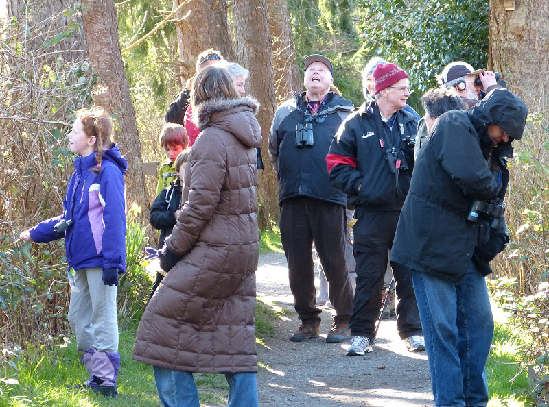 Reifel was gorgeous and bird-filled. Everyone was oohing and aahing over the daffodils and the warm, wind-protected benches. Highlights from the many birds (checkout the DNCB Picasa site) were four Black-crowned Night-Herons, a Great Horned Owl, a Marsh Wren singing amongst a terrace of nests, a Ruby-crowned Kinglet in full song, and a Brown Creeper with a beak filled with nesting material. Spring signs were everywhere: Violet-green Swallows graced the air while Mallard wars raged below. Feathers flew.