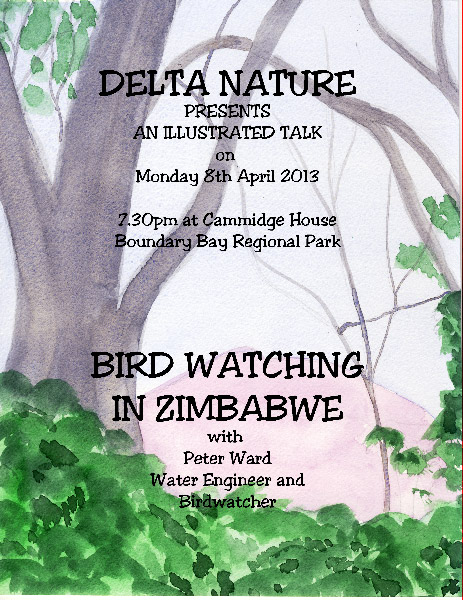 Don’t forget our monthly Delta Nats meeting next Monday, April 8 at 7:30 p.m. at Cammidge House where renowned Peter Ward will give an illustrated presentation on his Birding Adventures in Zimbabwe (see poster below).