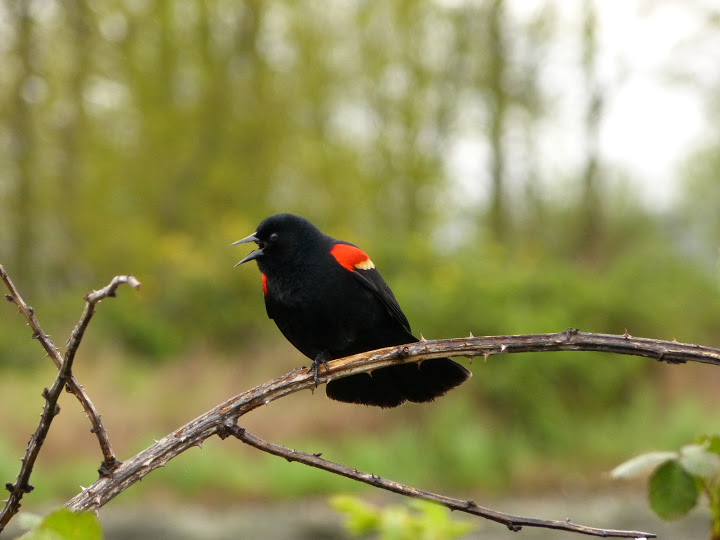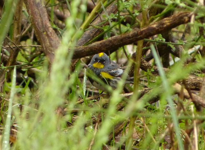 At the next pond we searched in vain for Yellow-headed Blackbirds, lots of brilliant Red-wings, and we saw a Pied-billed Grebe. Then we heard a Virginia Rail, and after Janet spotted it in front of us, everyone got good looks at this “hard to see” Rail racing through the reeds. Little birds were calling in the bushes and some of us saw Ruby-crowned Kinglets, 4 Sparrow species (Song, Fox, Golden- and White-crowned) and we finally got good looks at Yellow-rumped (Audubon) Warblers.