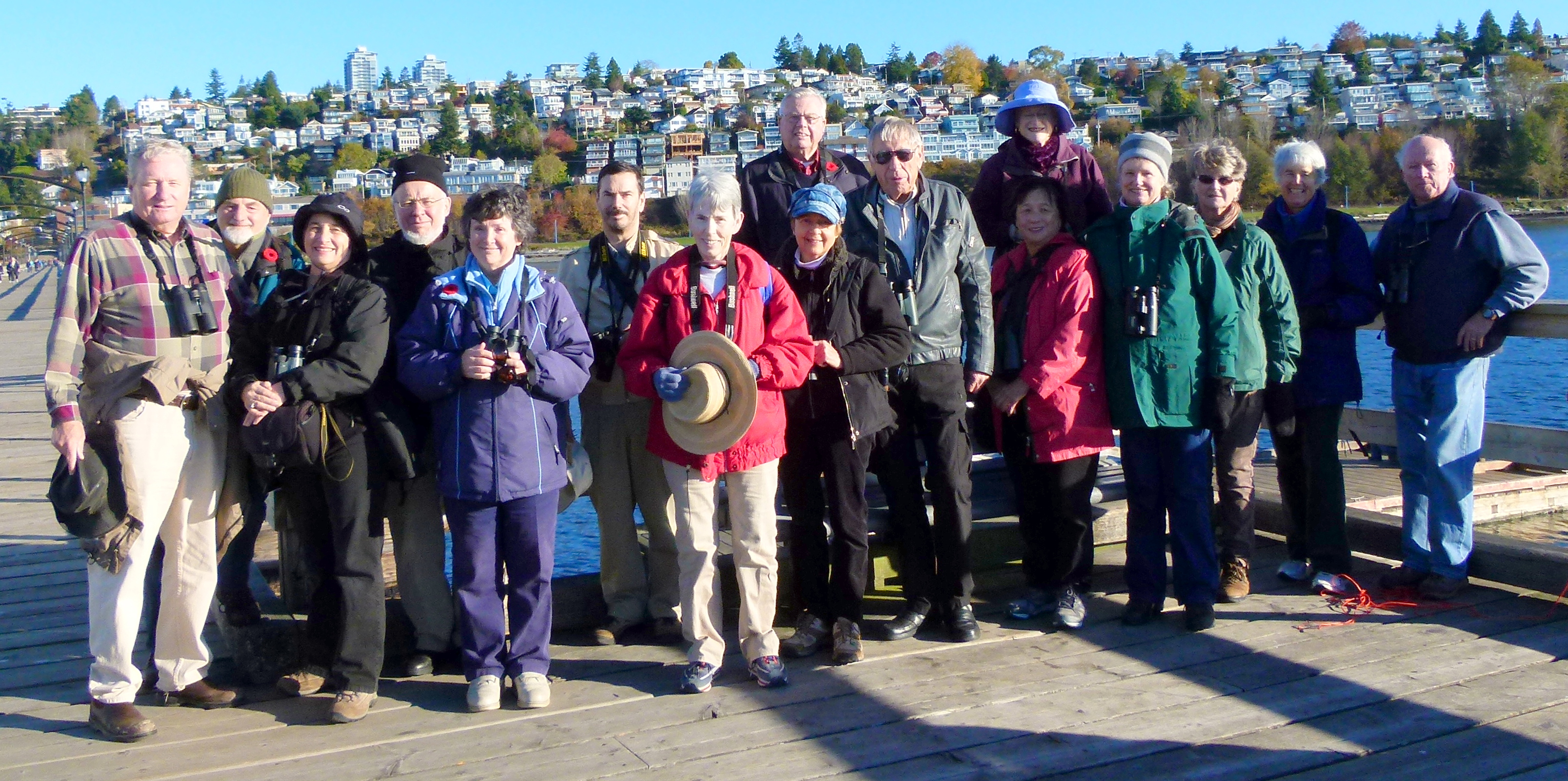 Two noisy female Belted Kingfishers posed, which pleased PB Lorna. A pair of Bald Eagles caught our attention as they danced together in a fly-over. Roger took the obligatory Group Photo at the end of the pier before we all hustled back to the parking lot to avoid the Ticket Police at 10:00 a.m. Some drove directly, others (Roger who?) circuitously to Blackie Spit (BS).