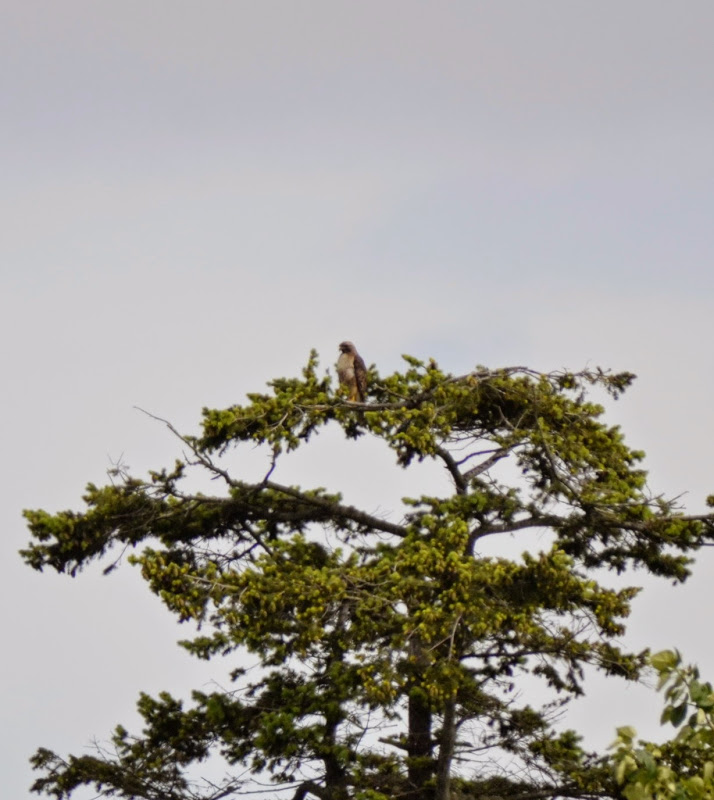 Next stop at the marina, we scoped a few Harlequin Ducks. Roger spotted a Flycatcher that turned out to be a White-crowned Sparrow. The resident Red-tailed Hawk was on top of one of his regular tree roosts.