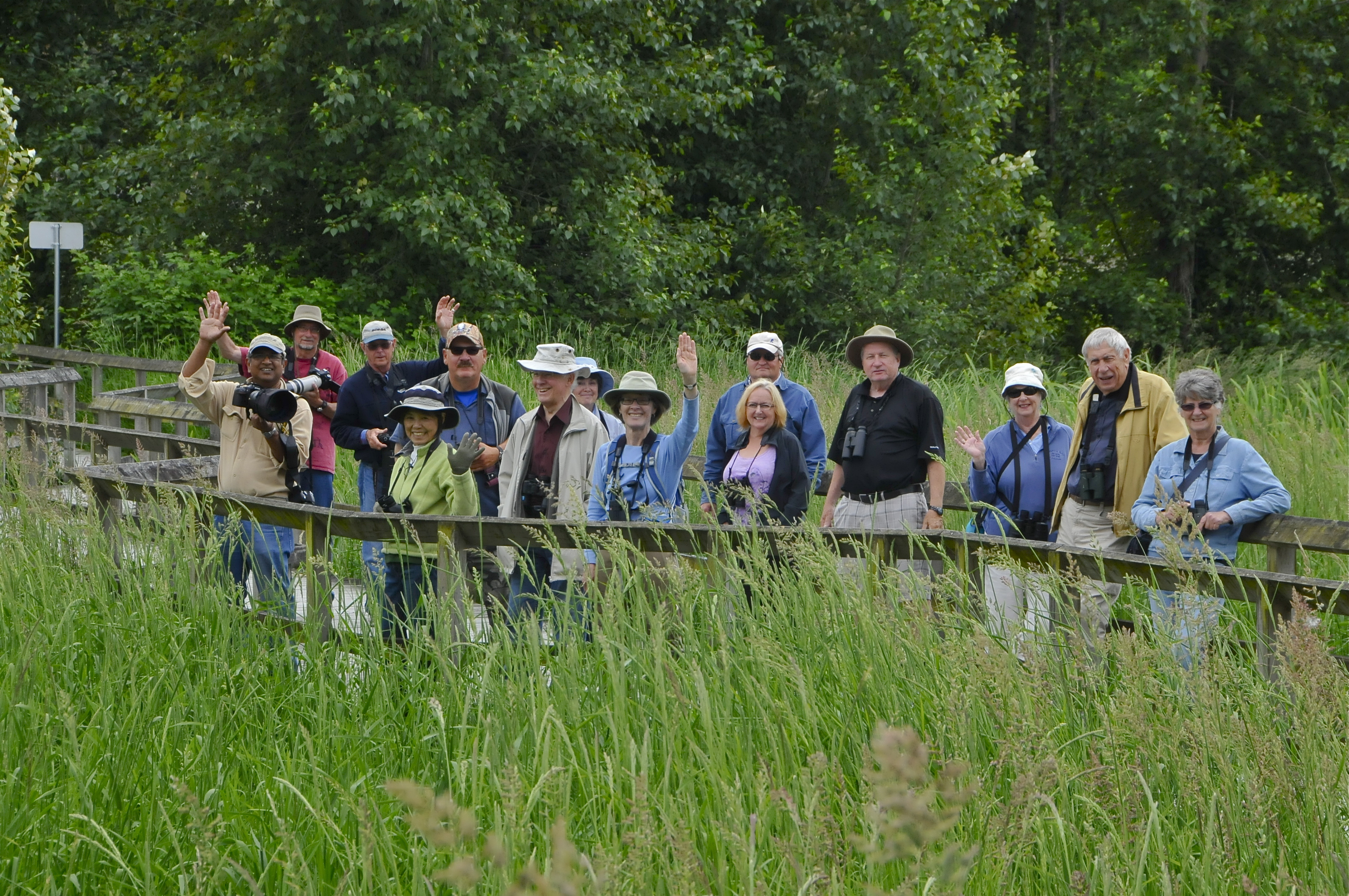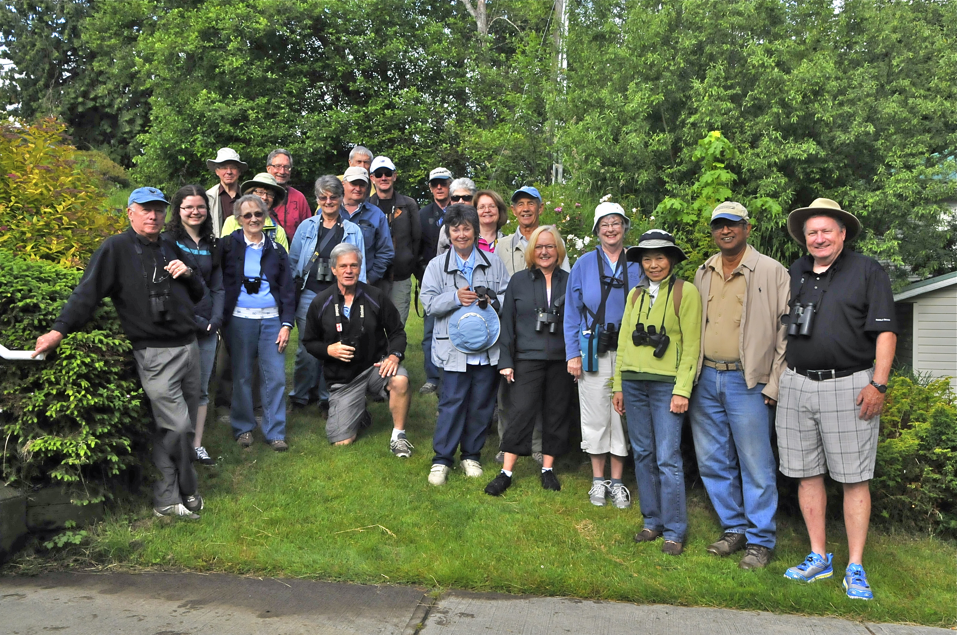 Our leader White Rock Al met us there along with Pauline, newbie “Tofino Groupies” Lois & Helen, Liz & daughter Laura (formerly Paula), early risers Kirsten & Roger, Johnny Mac, Richmond Bill, “work-sick” Deborah, and Ken without Anne. Garrulous Otto slept in and joined us later. Following intro’s, we wandered around the Hatchery grounds, admiring the empty tanks with disappointment. Al then led us on the path through the wooded area along the Little Campbell River (LCR). Along with Al’s almost interesting commentary (including on German history?), very informative signage on the flora and fauna in the Park was everywhere. Before the group dissipated into its usual unruly mass of mini conversation pools, we (Ken & Tony) took the Group Photo near the Wedding Arch. Around us were singing Black-headed Grosbeaks (BHG), Common Yellowthroats, Red-winged Blackbirds and Spotted Towhees.