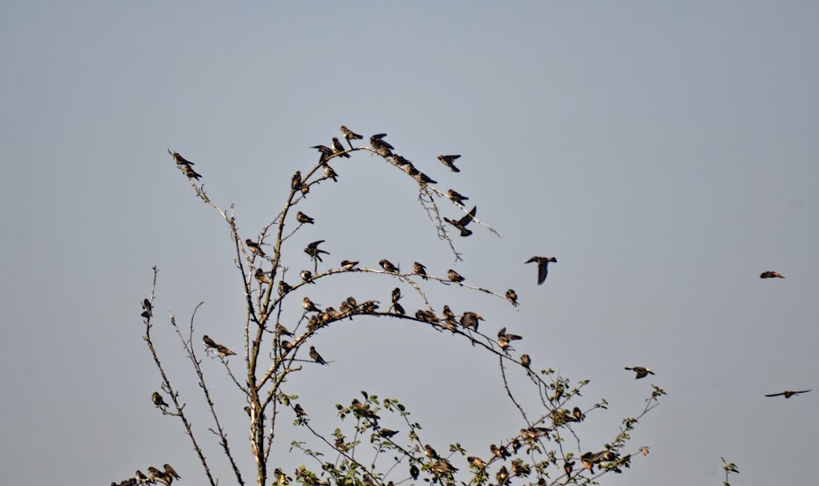The parents were returning with grubs for the young and some juveniles were seen. The air was full of bird chatter – we spotted Cedar Waxwings, Swainson’s Thrush, a Willow Flycatcher, a Starling nest, a beaver lodge, and a tree full of Tree and Cliff Swallows.