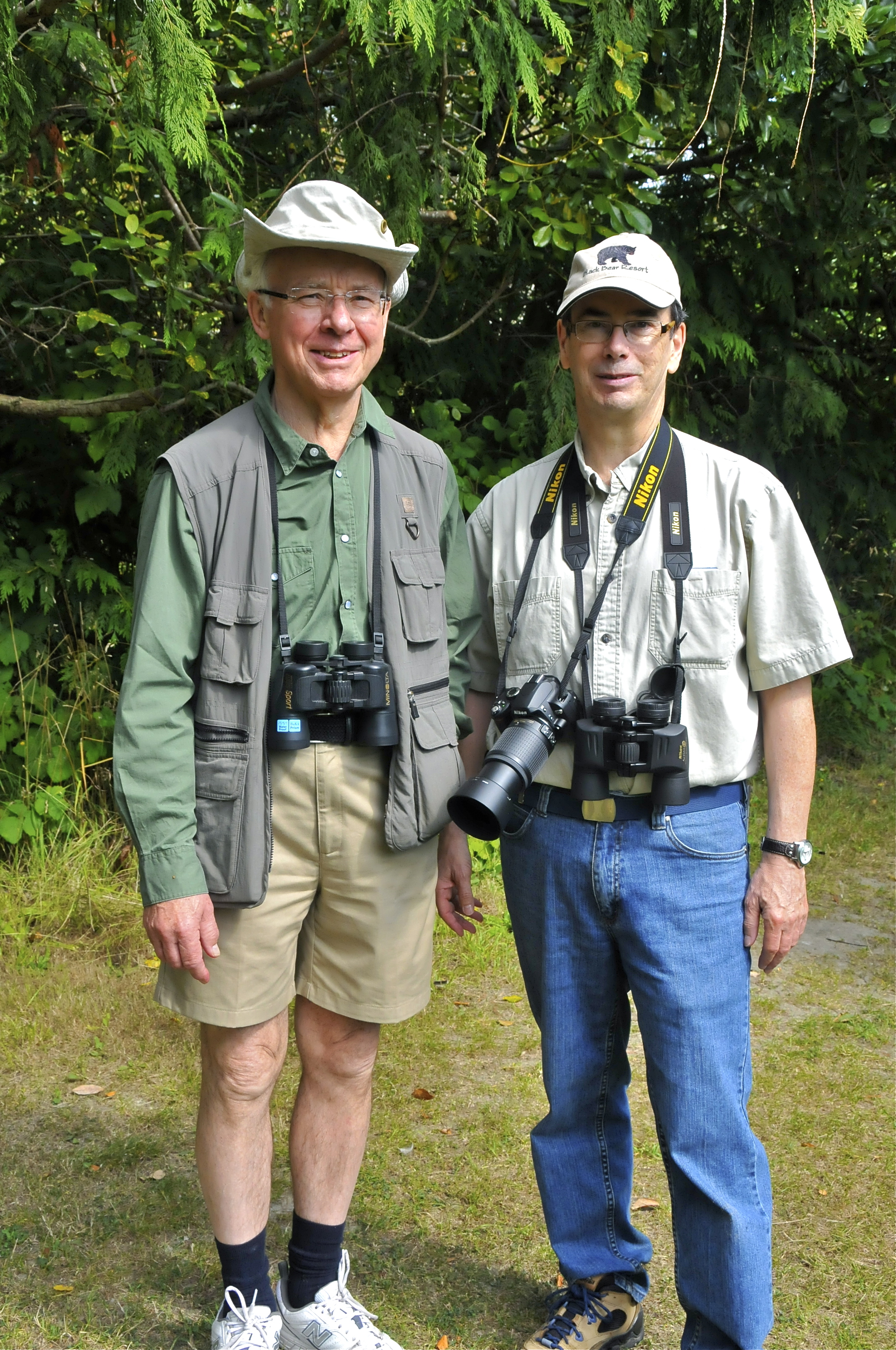 We eventually found our target birds, two Stilt Sandpipers in the outer pond. They were near a flock of Long-billed Dowitchers. A Greater Yellowlegs moved between the two sandpipers and it was neat to compare the size and other identification markings. The outer ponds had more Shovelers, Gadwalls, Green-winged Teal and I tried unsuccessfully to claim a Blue-winged Teal sighting. The view from the Tower was brilliant. A Cooper’s Hawk roosting in a tree along the path gave a photogenic fly-past for us. Sleek Cedar Waxwings also posed at eye-level in the tree tops. We were blanked on Warbler sightings along the treed path where Townsend’s, Orange-crowned and Yellow Warblers had been seen earlier. But we had fun hand-feeding the Chickadees. Tony got a nice shot of a Brown Creeper, and WR Al continued his biological descriptions and explanations of the various trees and plants which again fell on deaf ears.